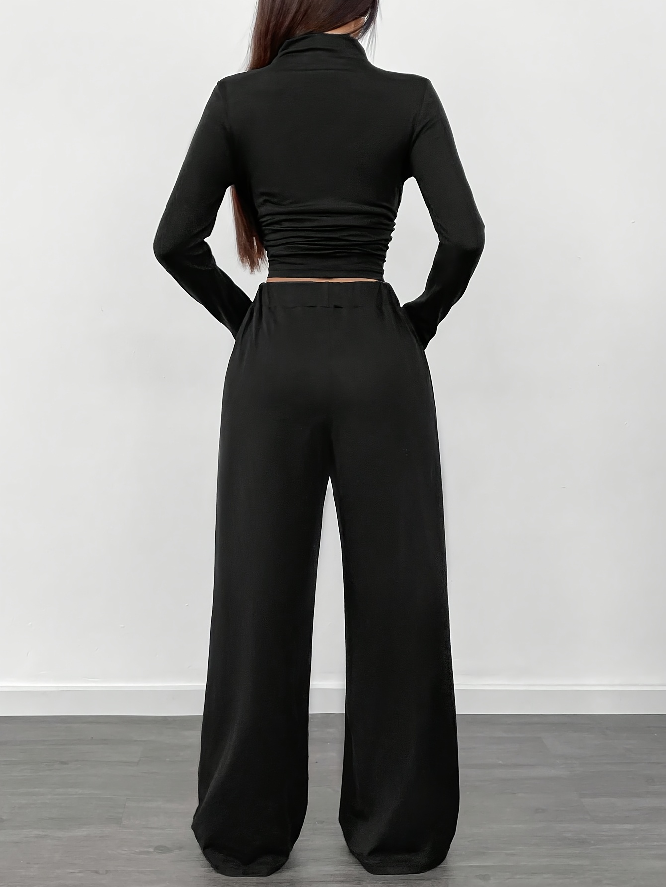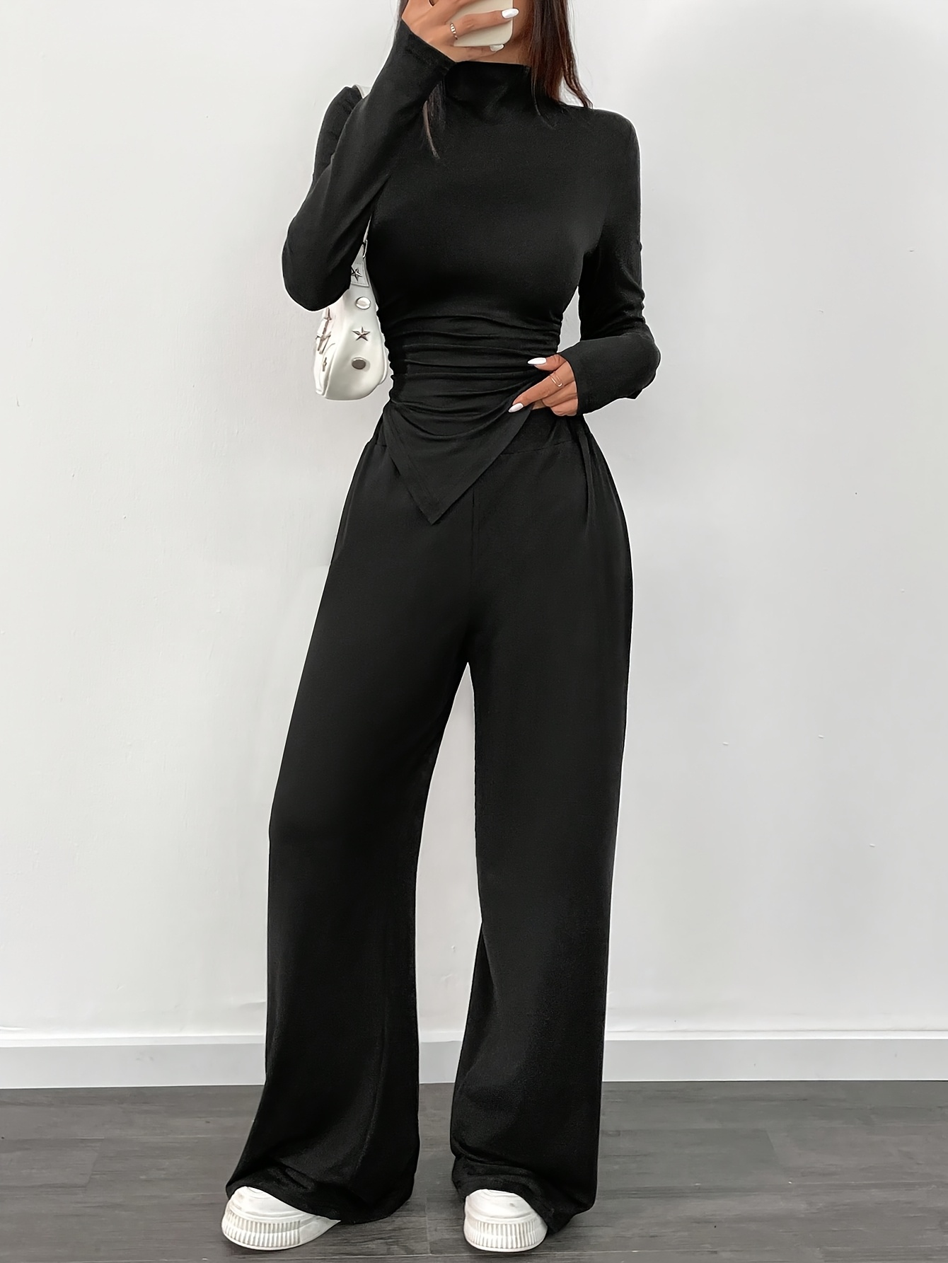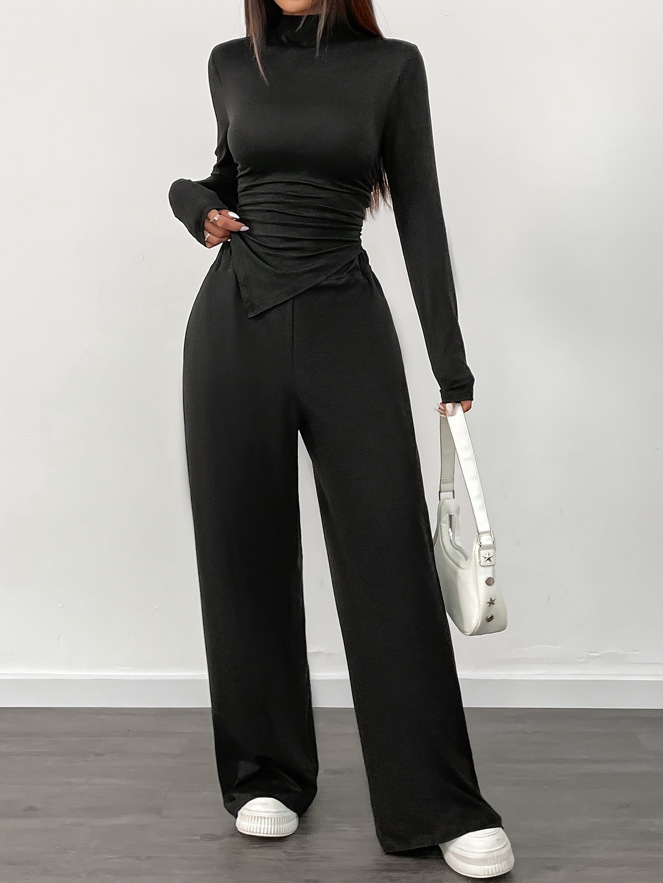 Make a statement with this women’s two-piece outfit set, featuring an asymmetrical ruffled long-sleeve shirt paired with wide-leg pants for an effortlessly chic look. The unique asymmetrical design adds a touch of elegance, while the flowy wide-leg trousers ensure both comfort and style.