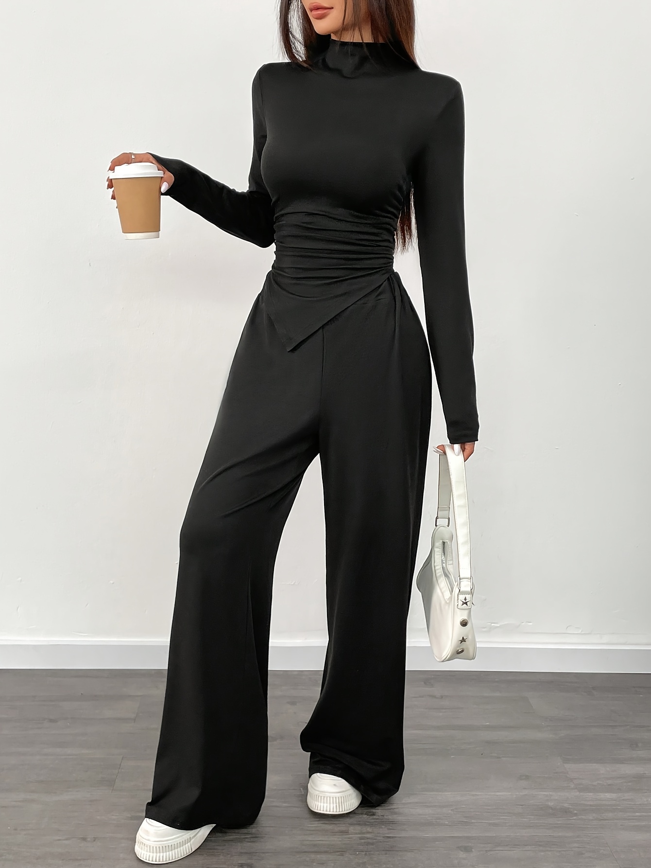 Women’s 2-Piece Set – Solid Color Asymmetrical Ruffled Long-Sleeve Shirt with Wide-Leg Pants | Casual Chic Spring/Summer Outfit