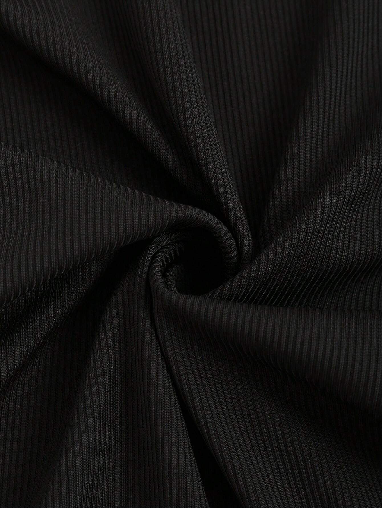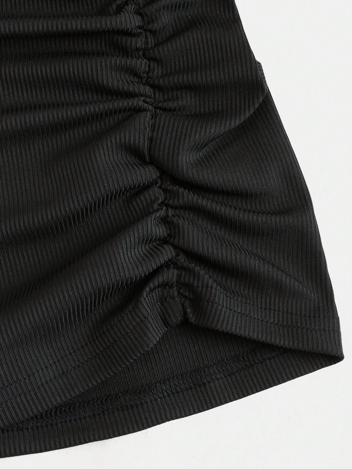 Made from a polyester-elastane blend (95% Polyester, 5% Elastane), the fabric offers medium stretch for a body-hugging yet comfortable fit. The ruched detailing adds texture and elegance, while the plain black finish makes it versatile enough to style for Oktoberfest in Munich, music festivals, or a night out in Brazil.