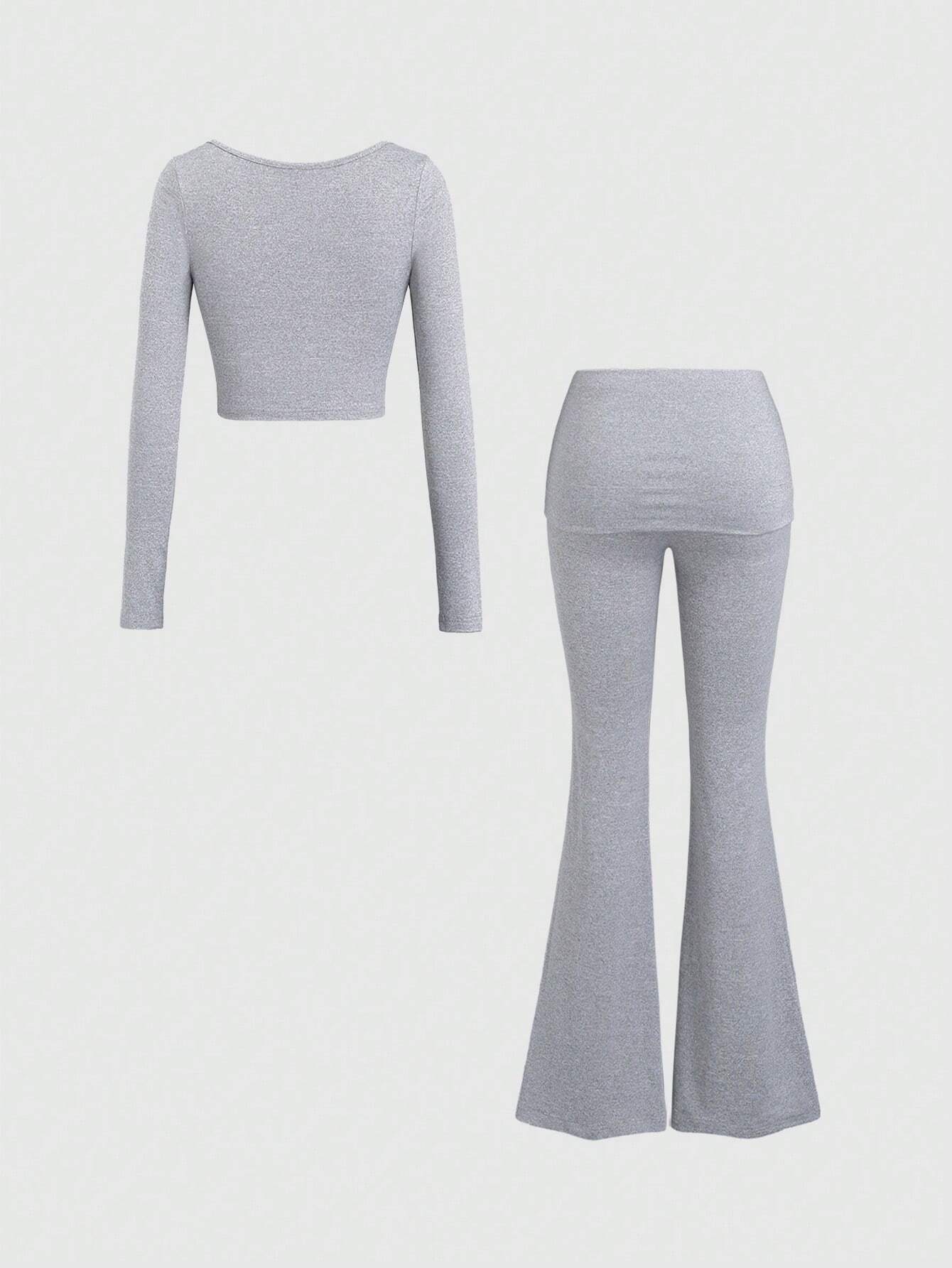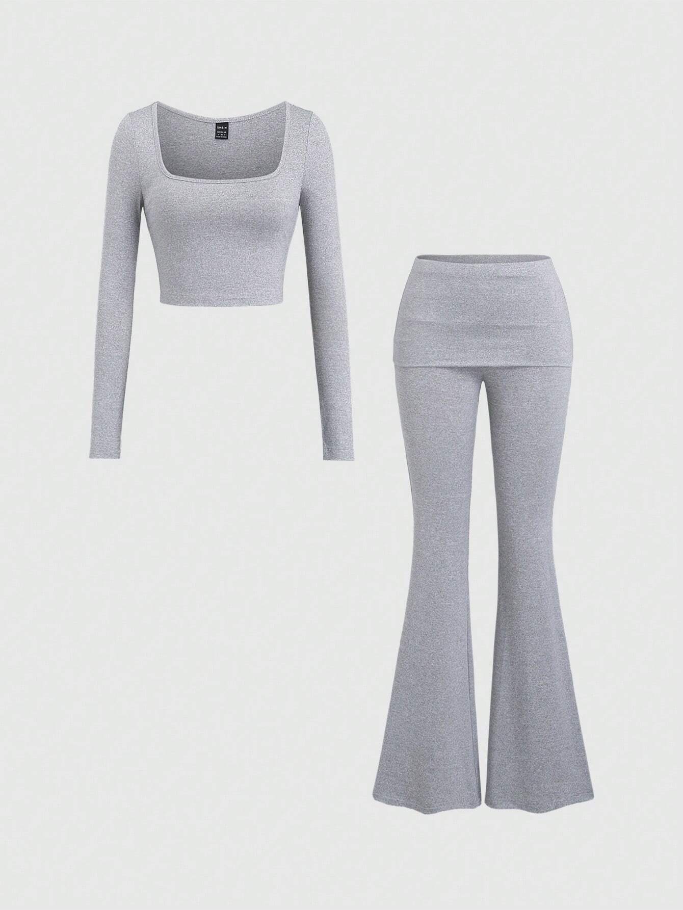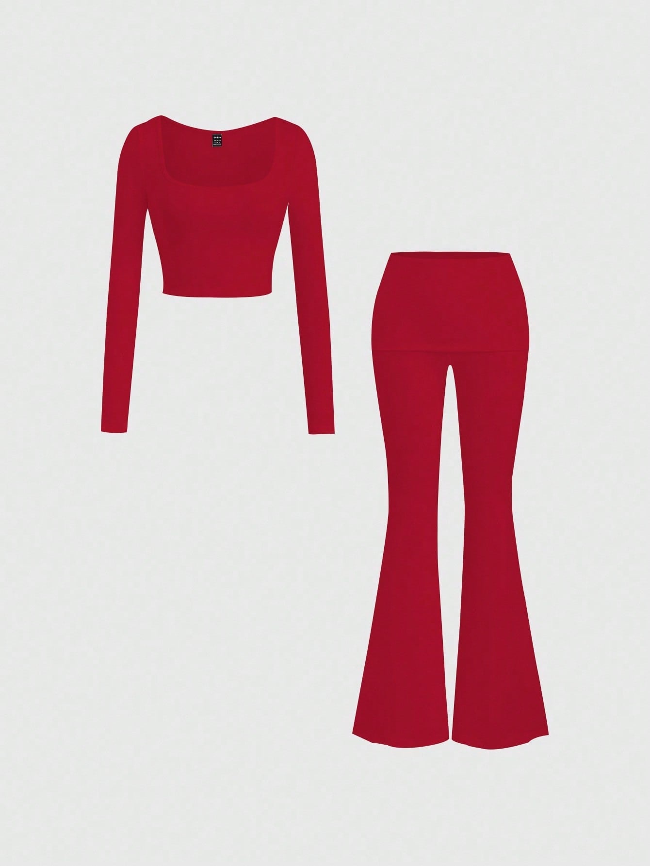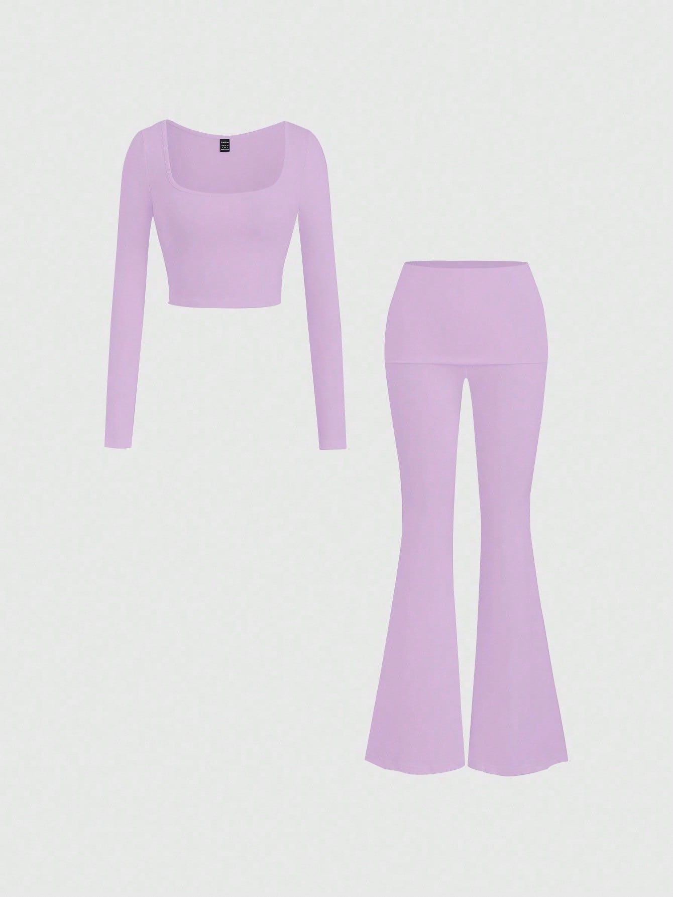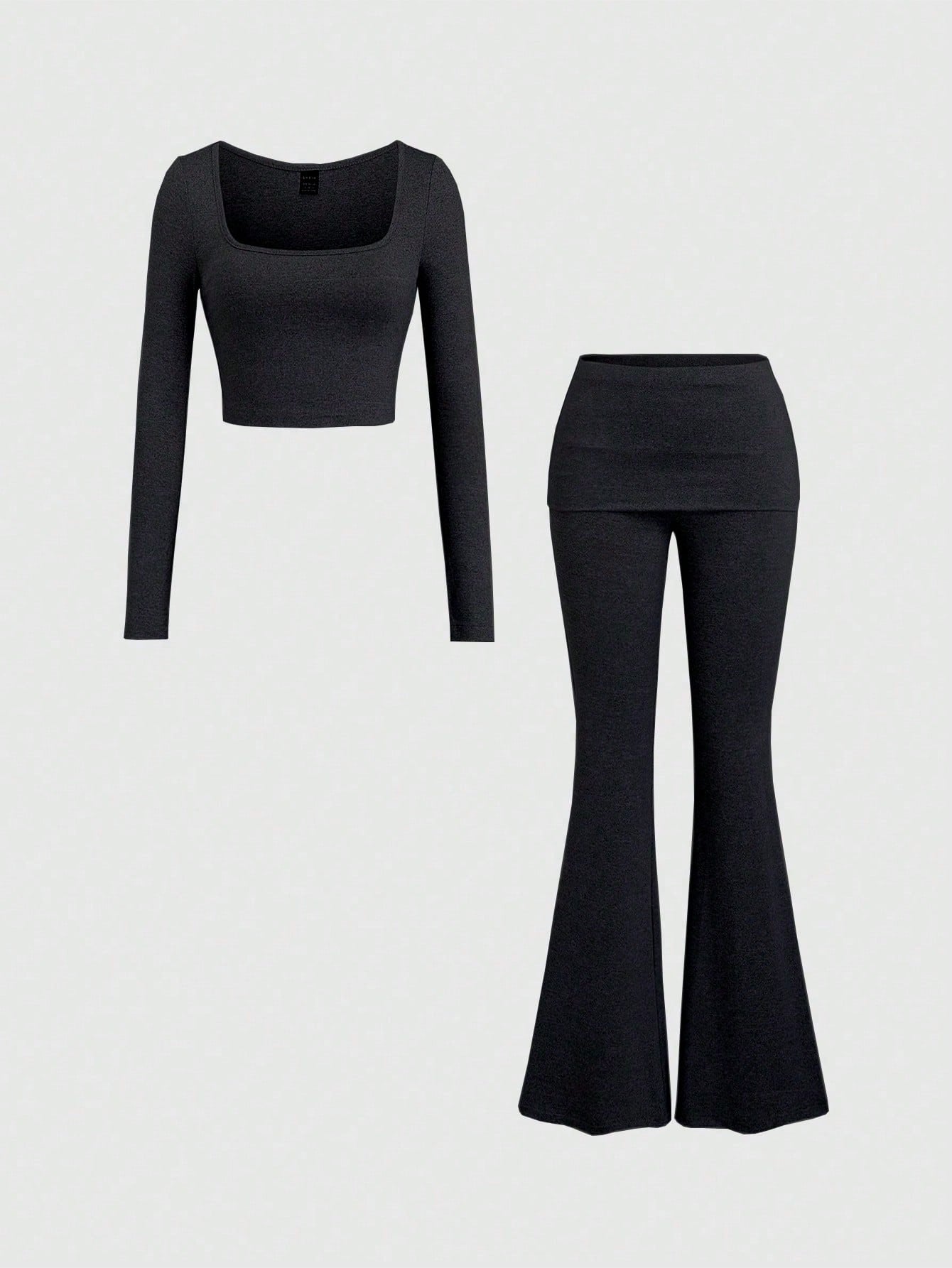 Flirla 2pcs Casual Women Spring/Summer Solid Square Collar Long Sleeve T-Shirt And Flare Pants Set Fall Cloth For Women