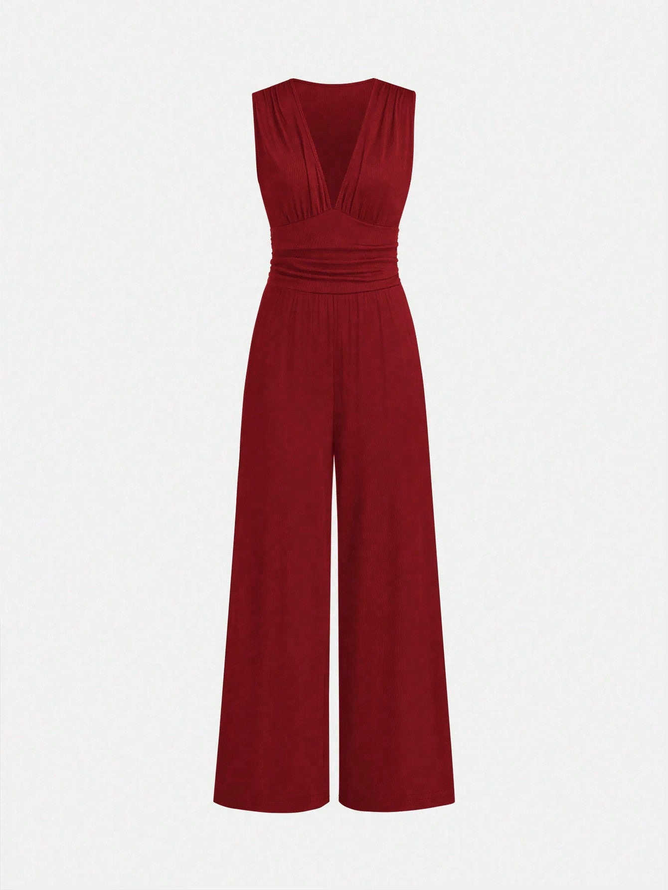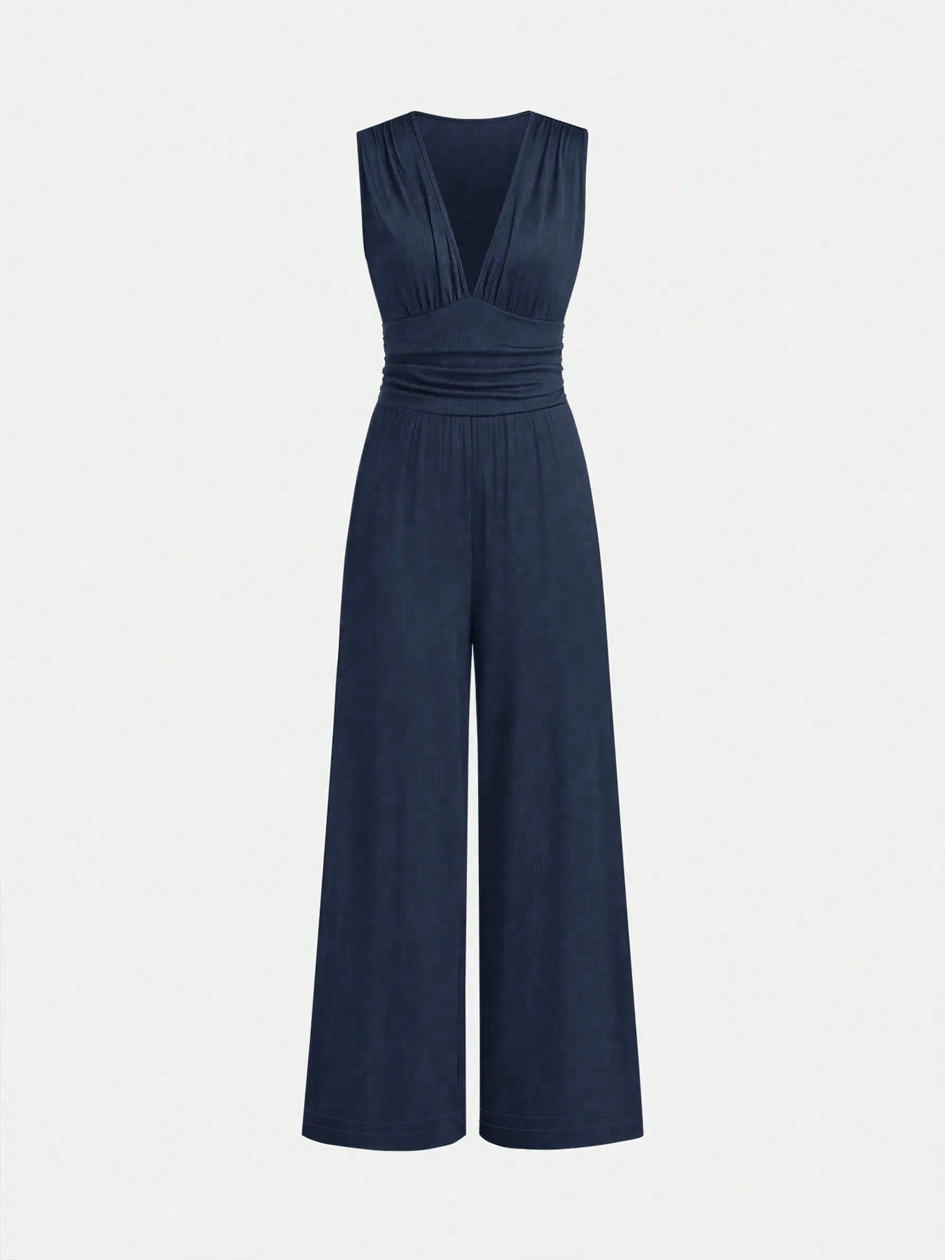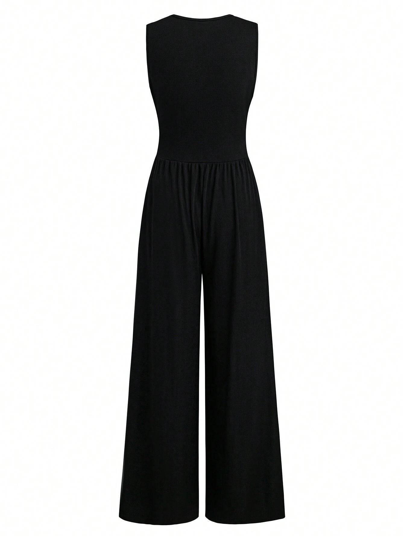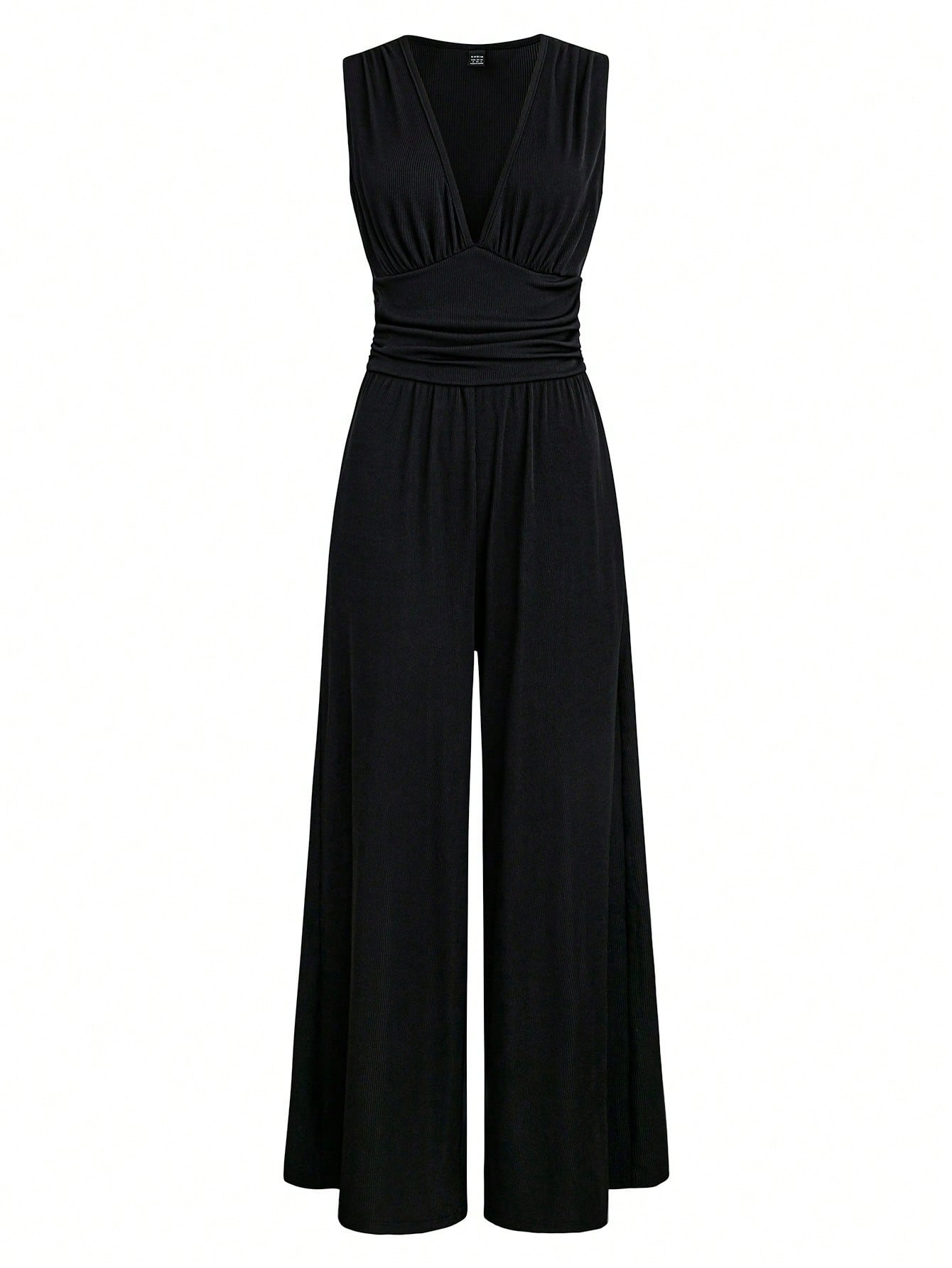 Women’s Elegant Deep V-Neck Jumpsuit – Sleeveless Pleated Wide-Leg Black Jumpsuit with High Waist & Backless Detail, Summer Outfit