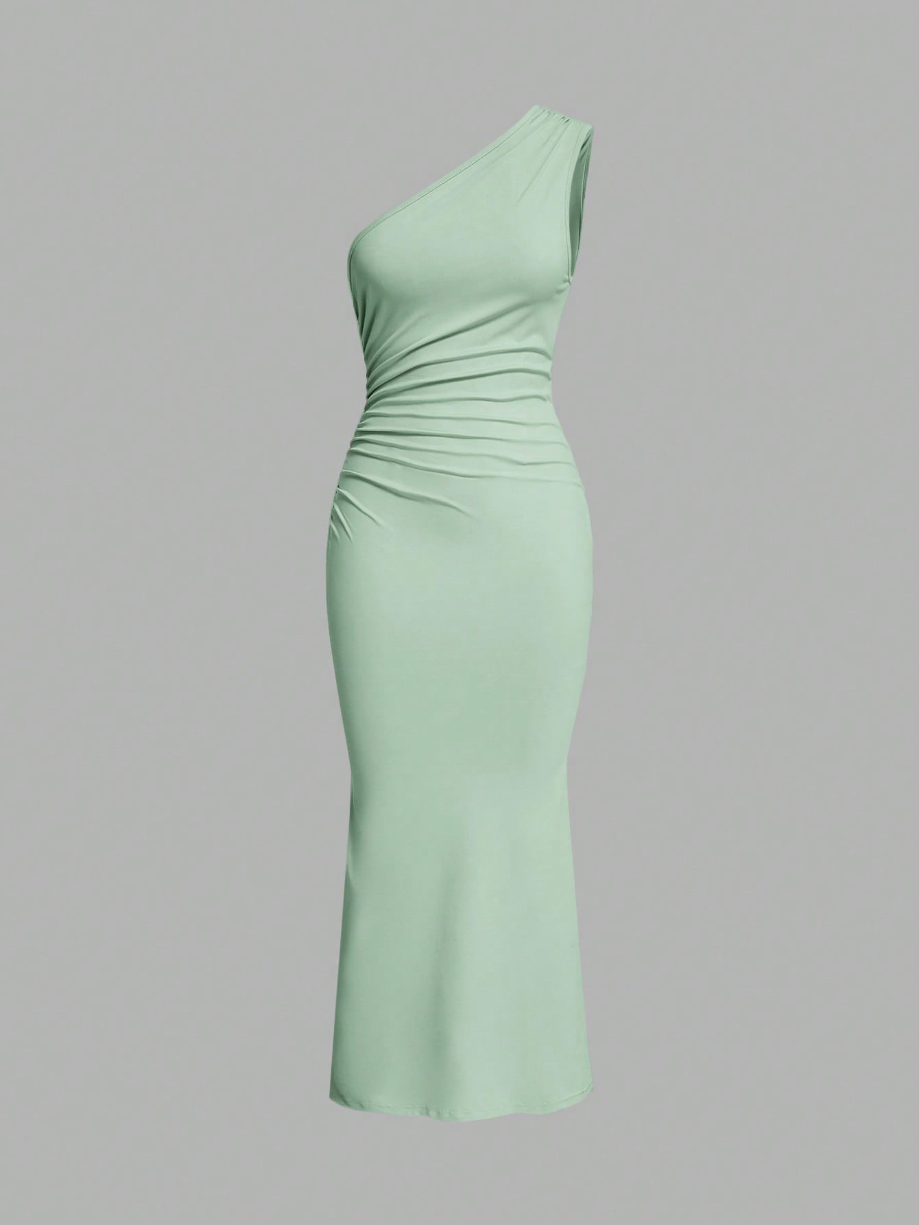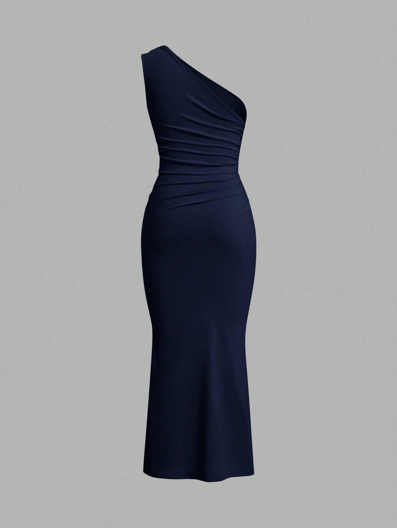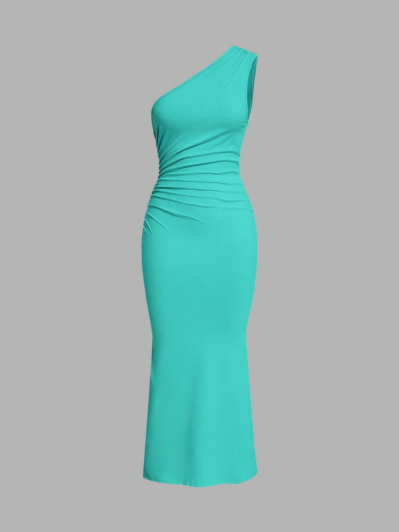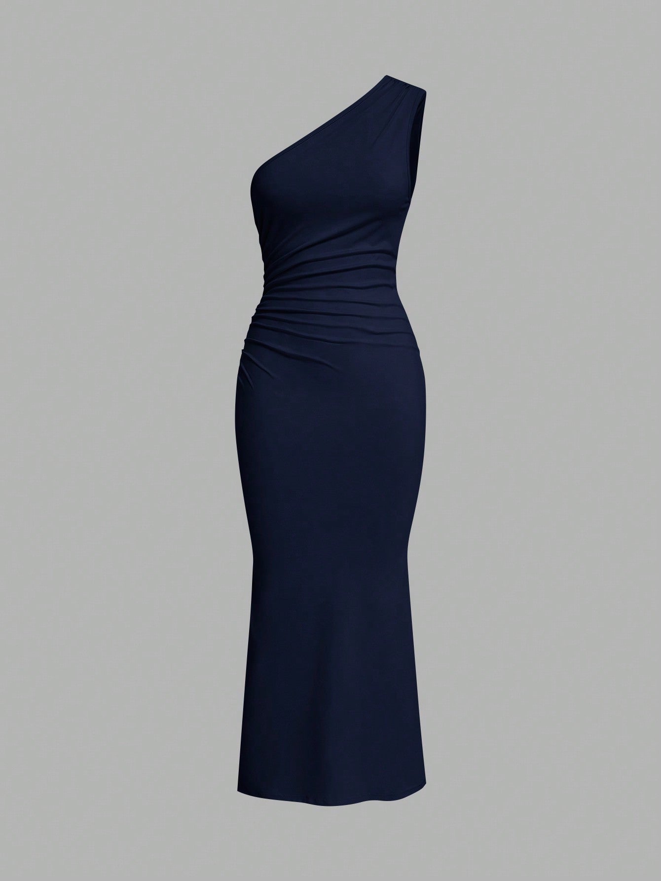 SHEIN EZwear Elegant Asymmetrical Shoulder Ruched Extra-Long Mermaid Dress,Summer Dresses For Women,Tea Party Dress