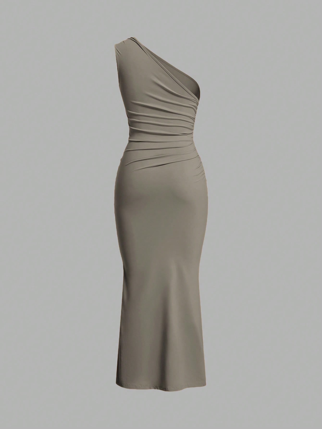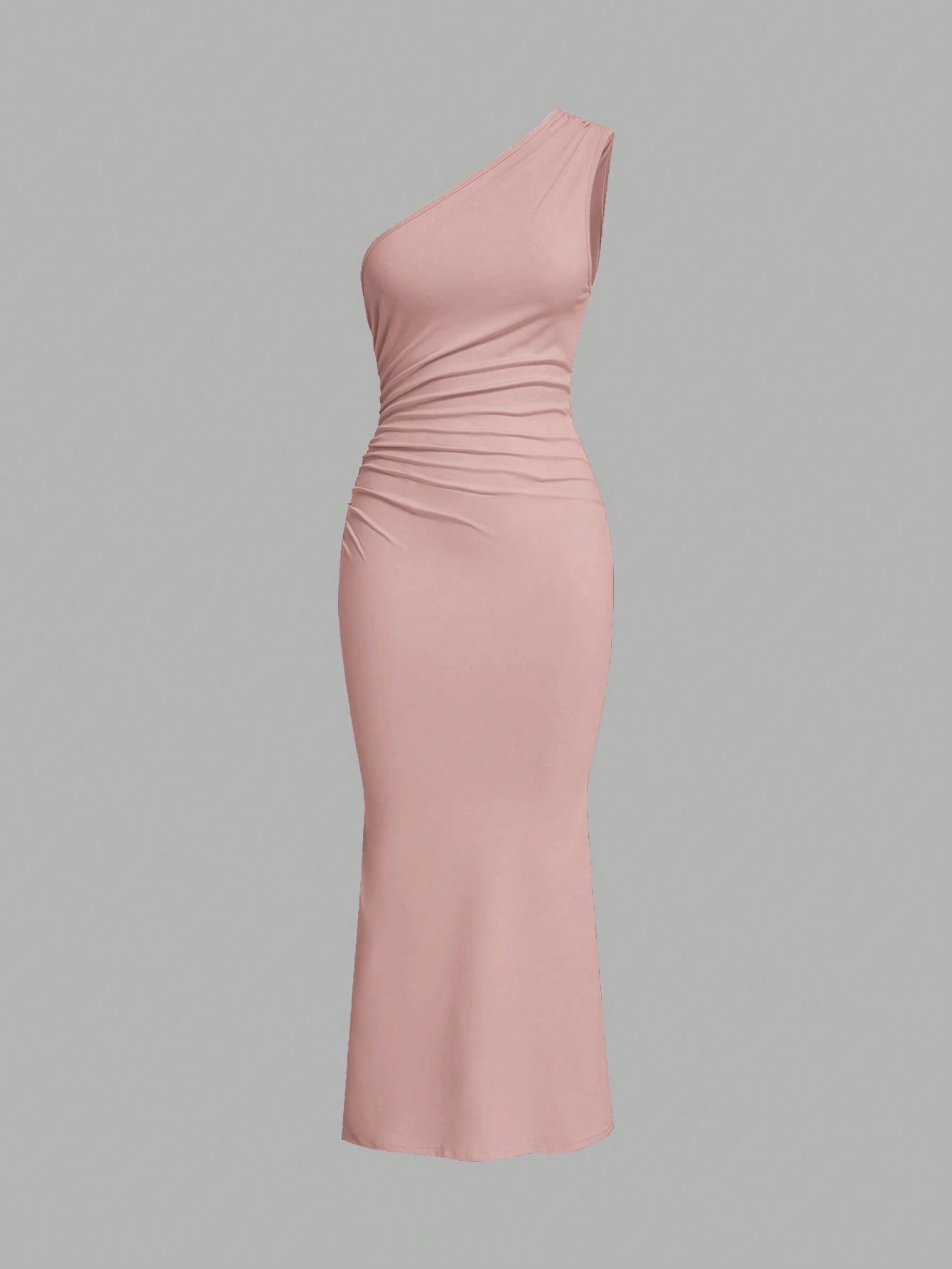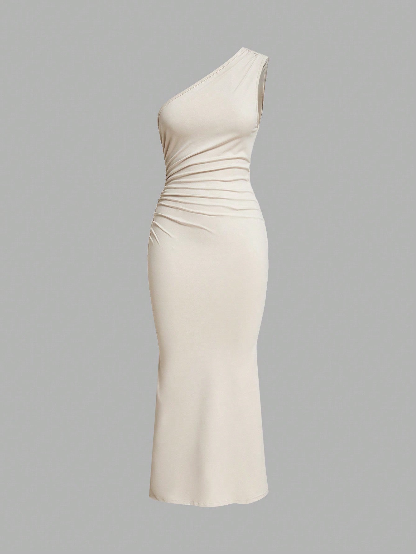 SHEIN EZwear Elegant Asymmetrical Shoulder Ruched Extra-Long Mermaid Dress,Summer Dresses For Women,Tea Party Dress