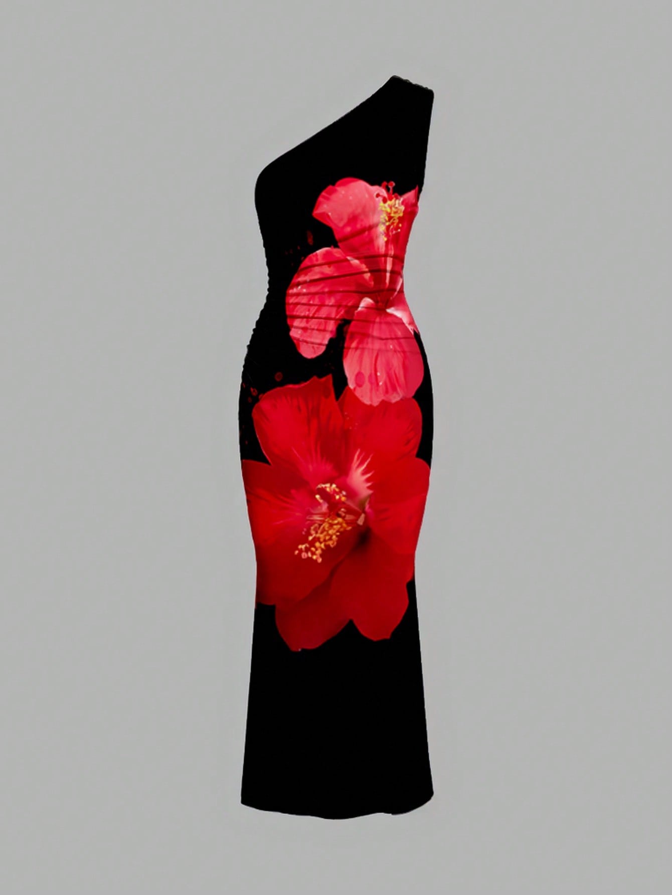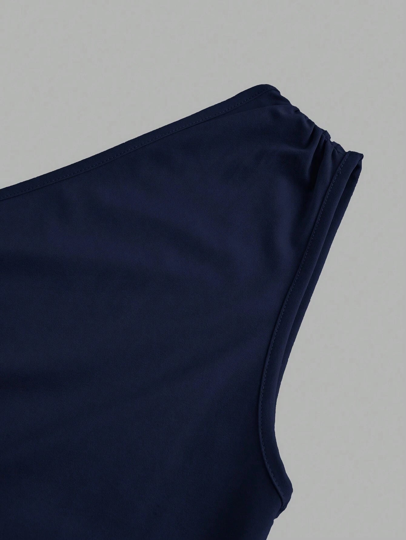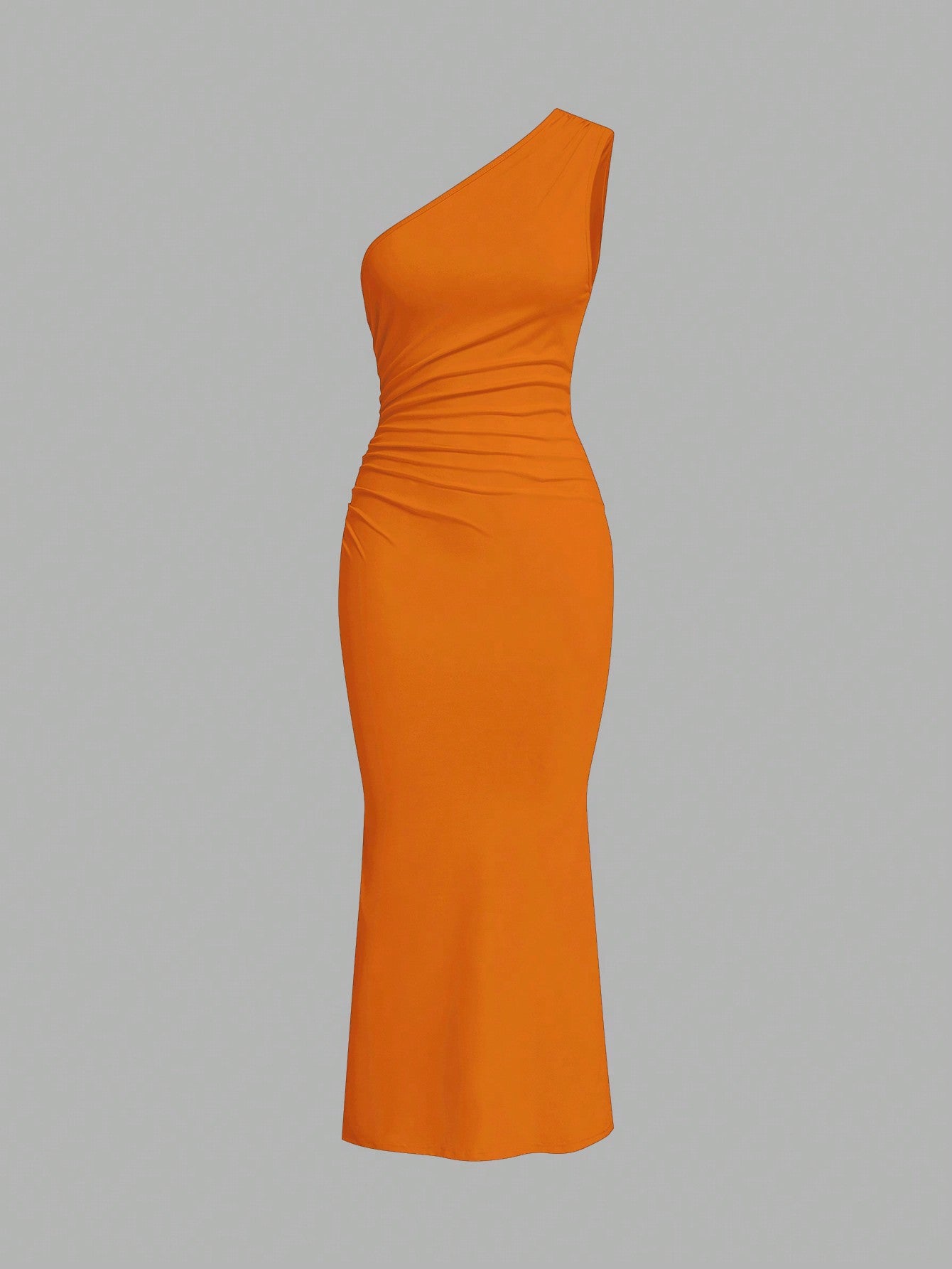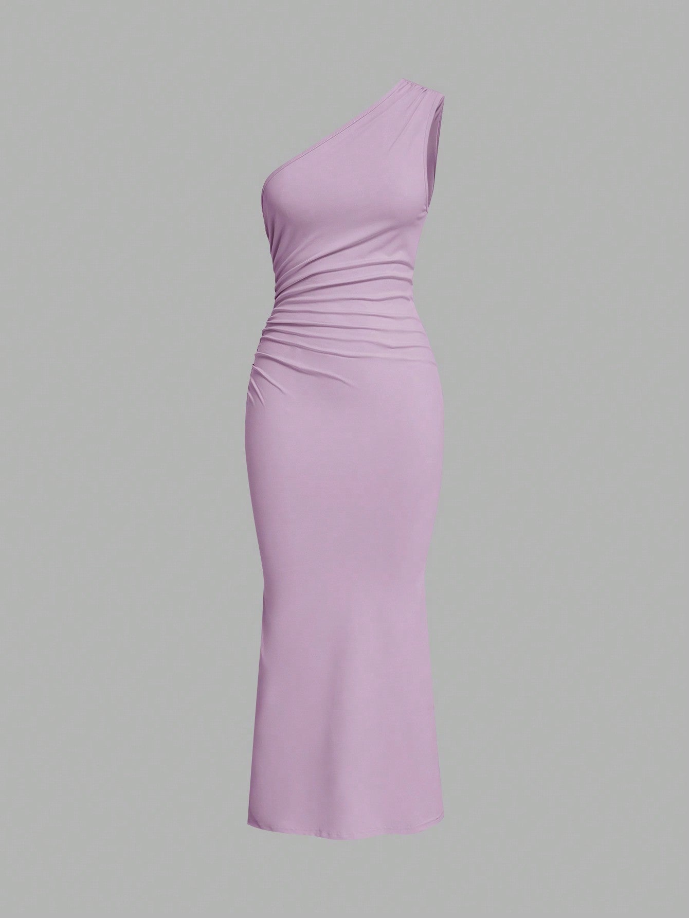 SHEIN EZwear Elegant Asymmetrical Shoulder Ruched Extra-Long Mermaid Dress,Summer Dresses For Women,Tea Party Dress