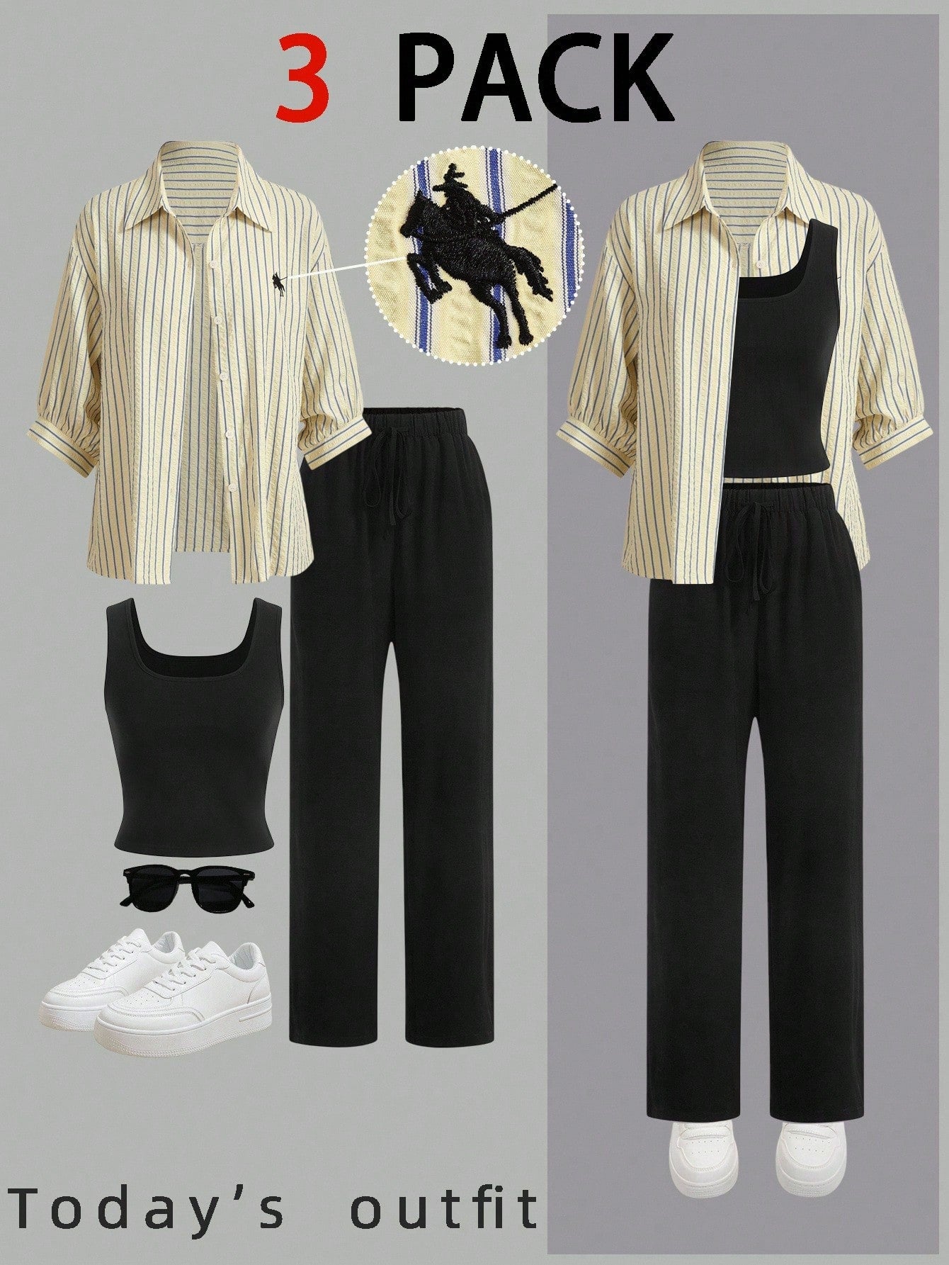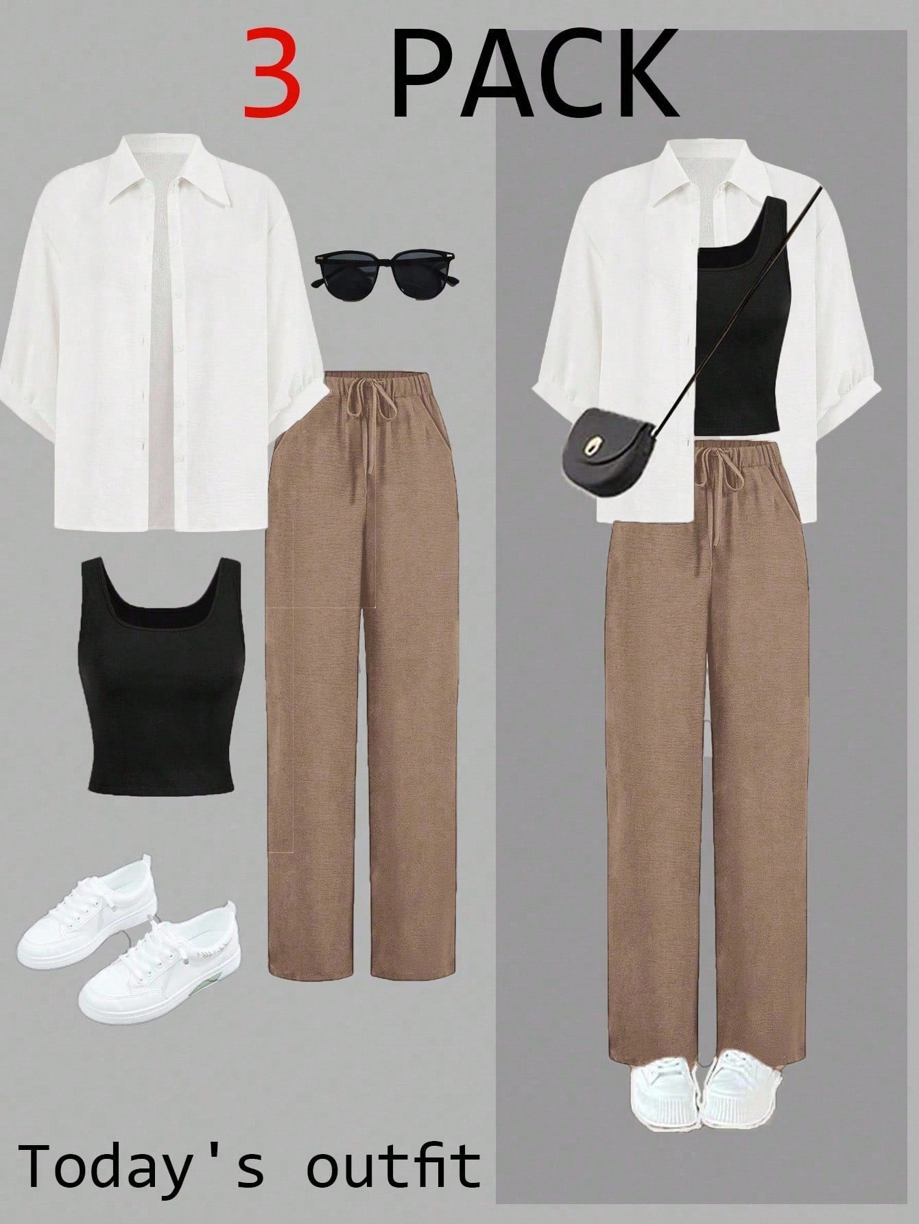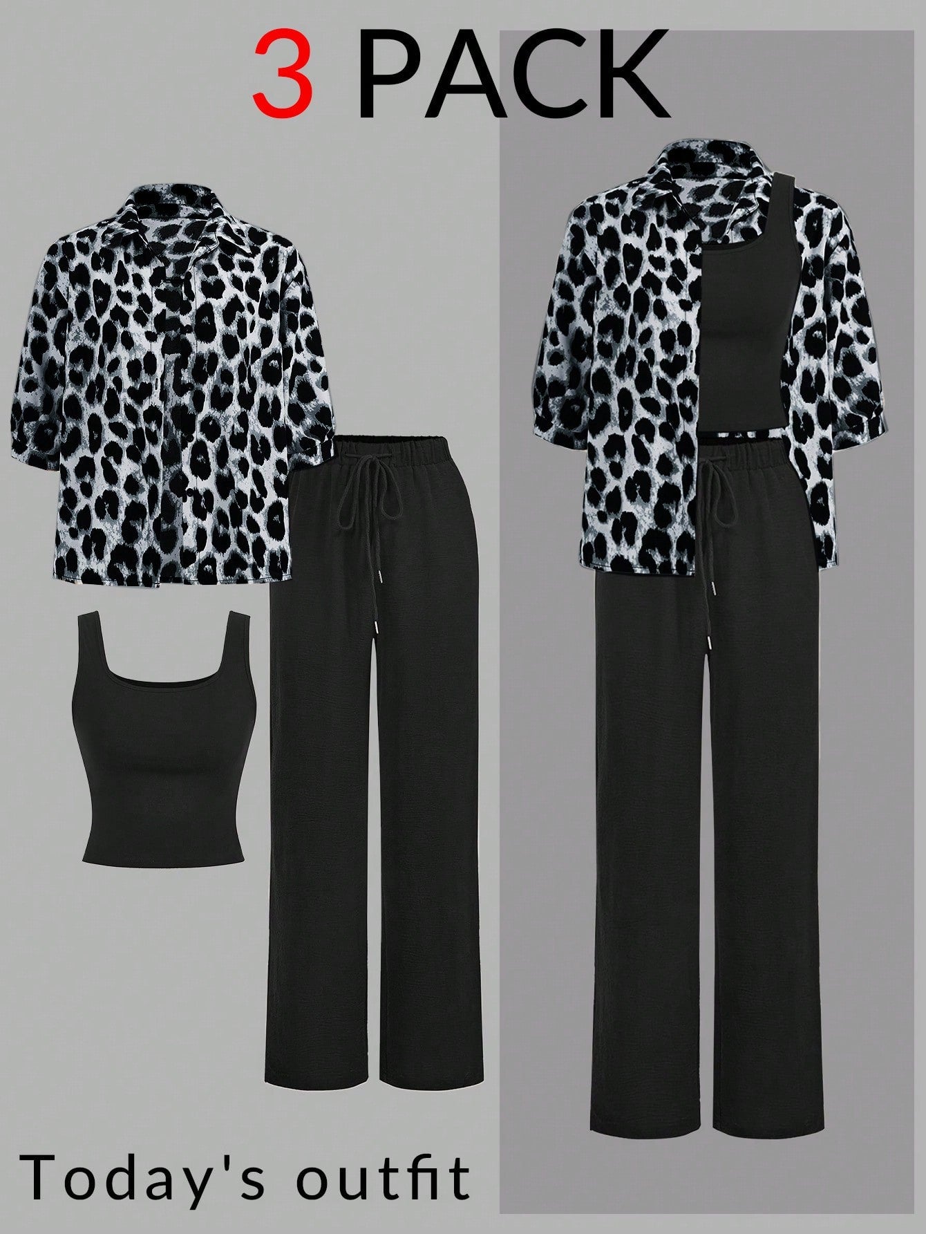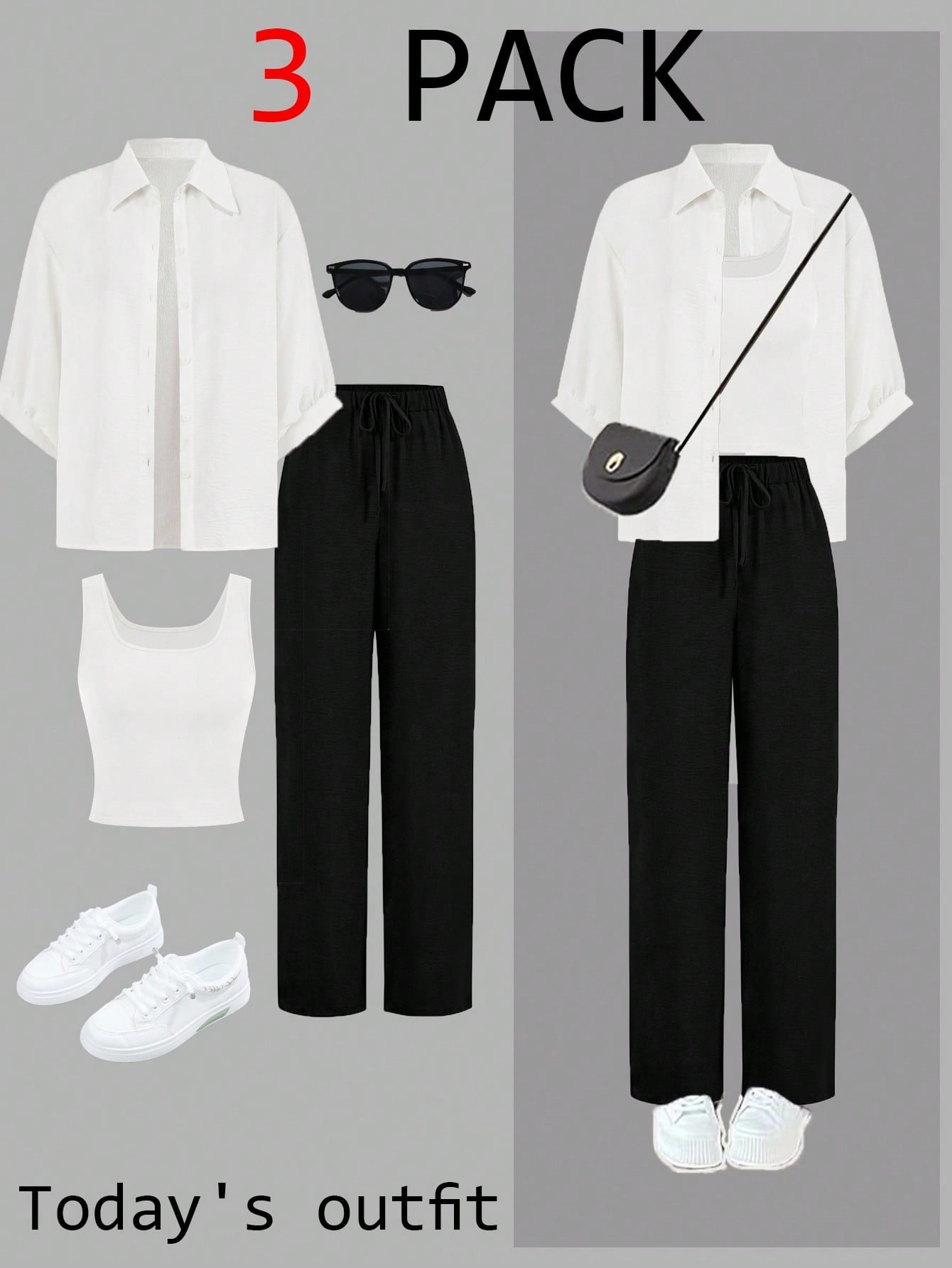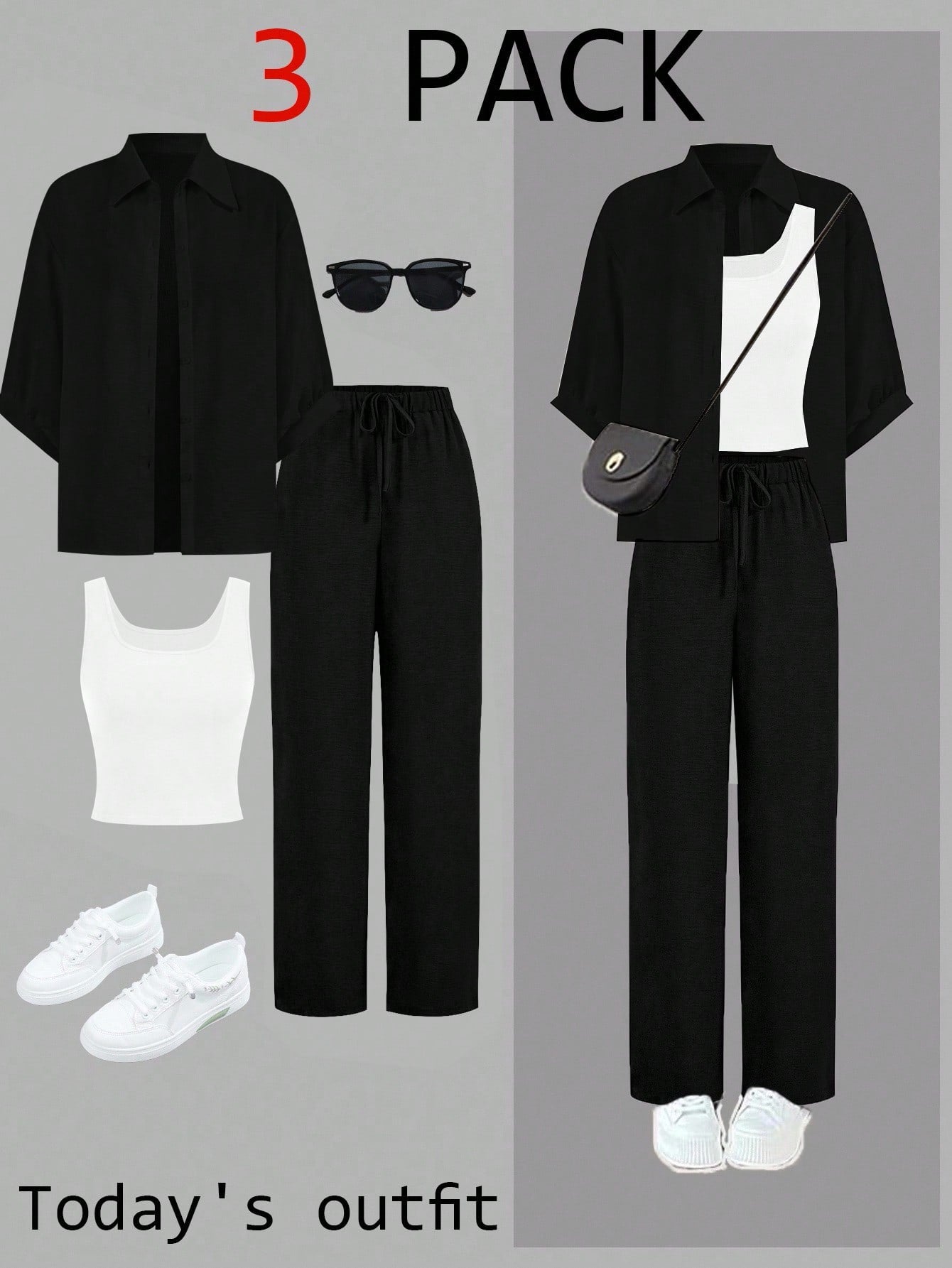 SHEIN LUNE 3pcs Black & White Maillard Women 2024 New Elegant Windbreaker Suit Set With Blouse And Wide Leg Pants, Stylish And Slimming, Autumn