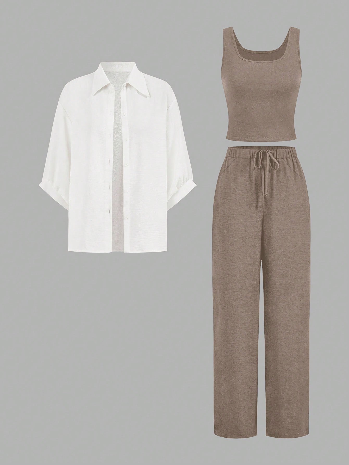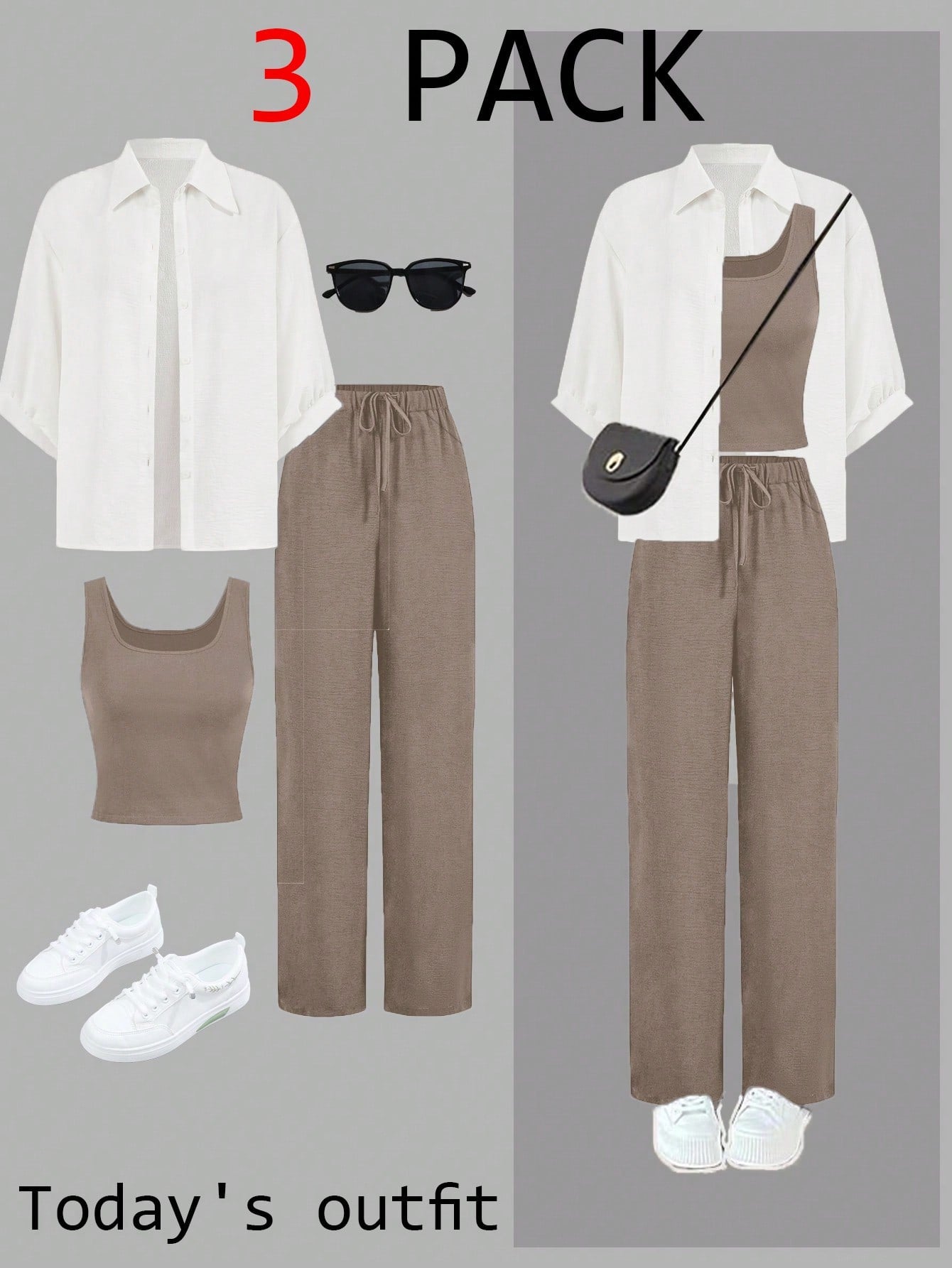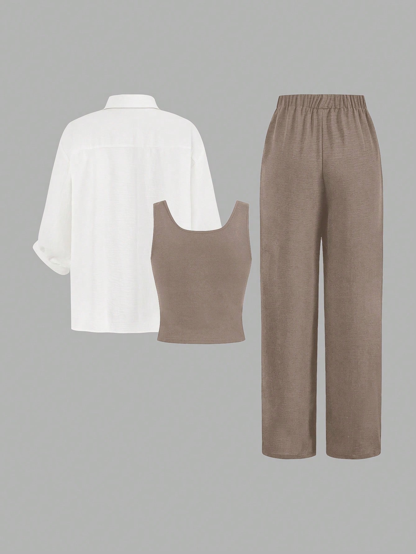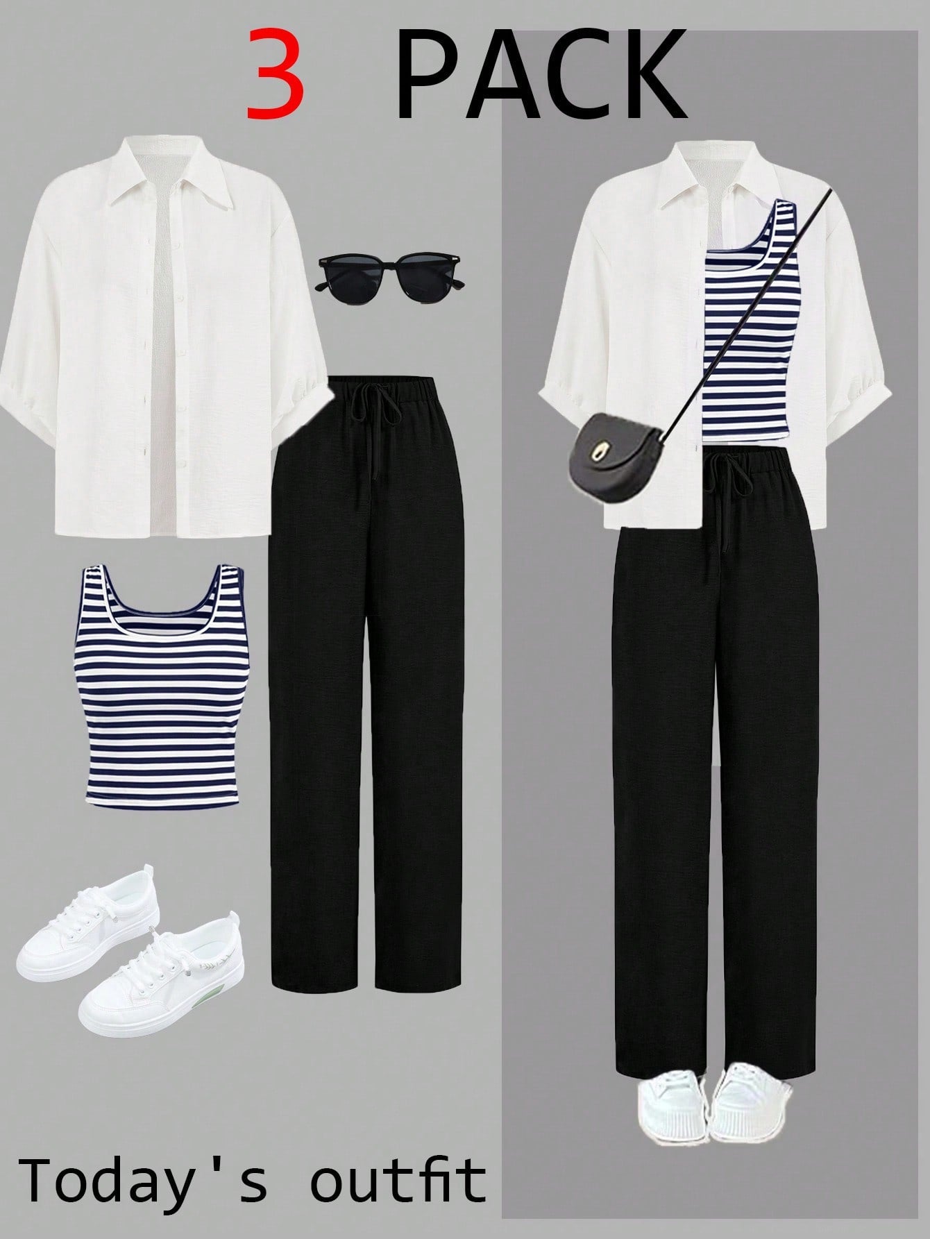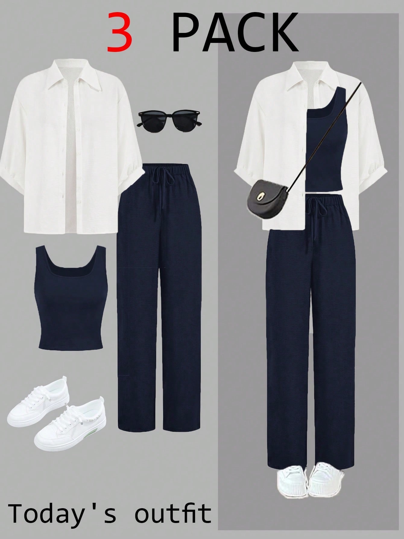 SHEIN LUNE 3pcs Black & White Maillard Women 2024 New Elegant Windbreaker Suit Set With Blouse And Wide Leg Pants, Stylish And Slimming, Autumn