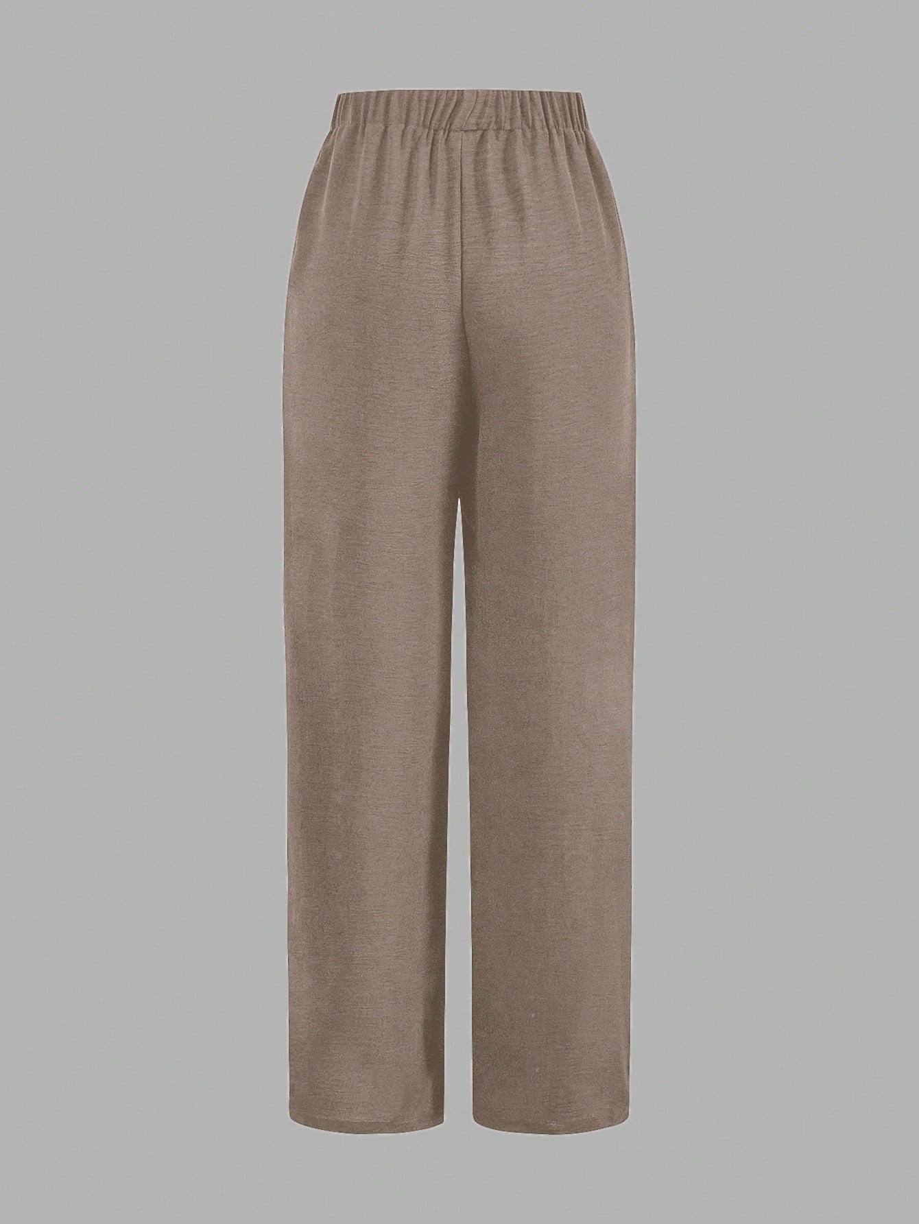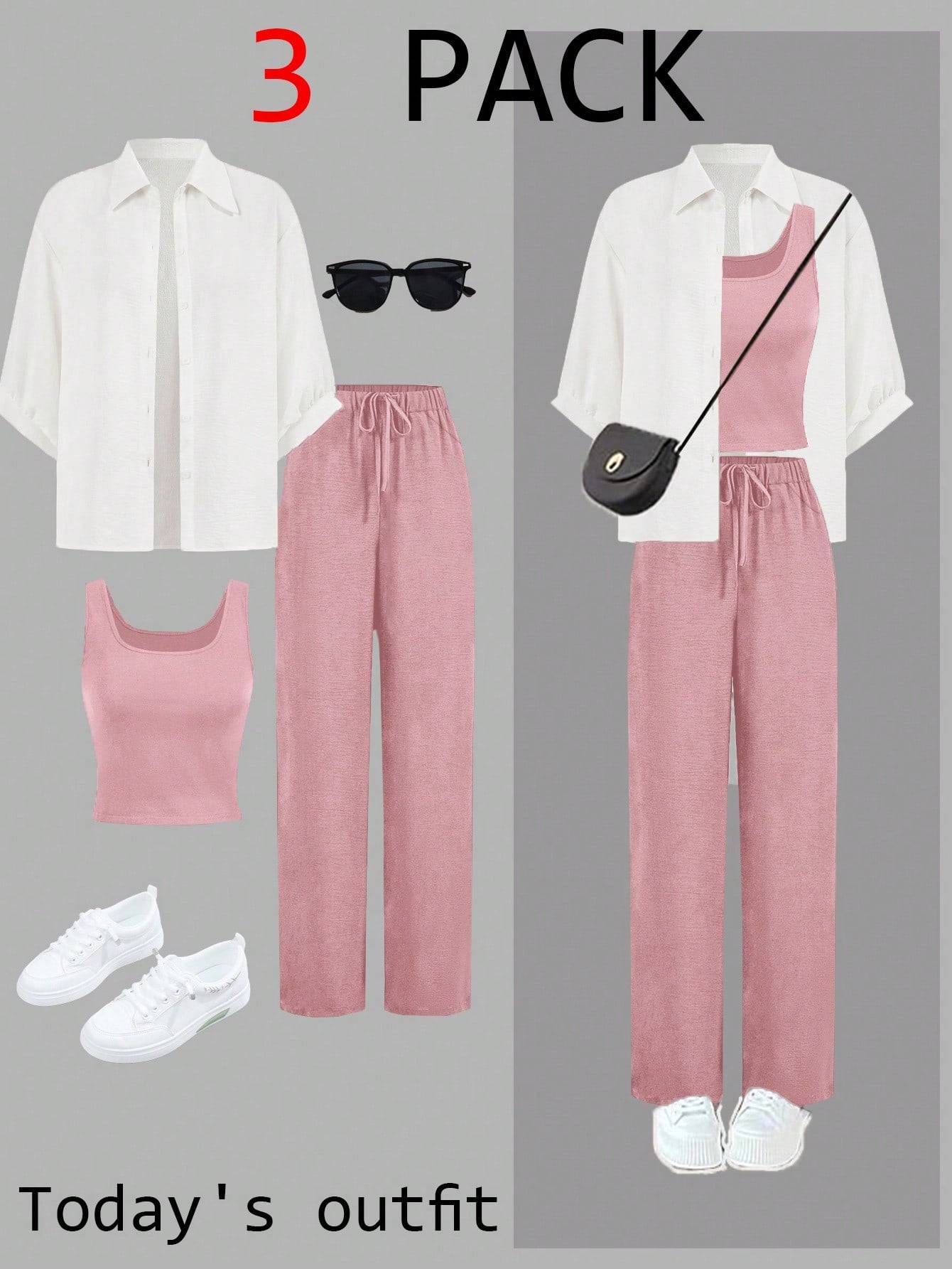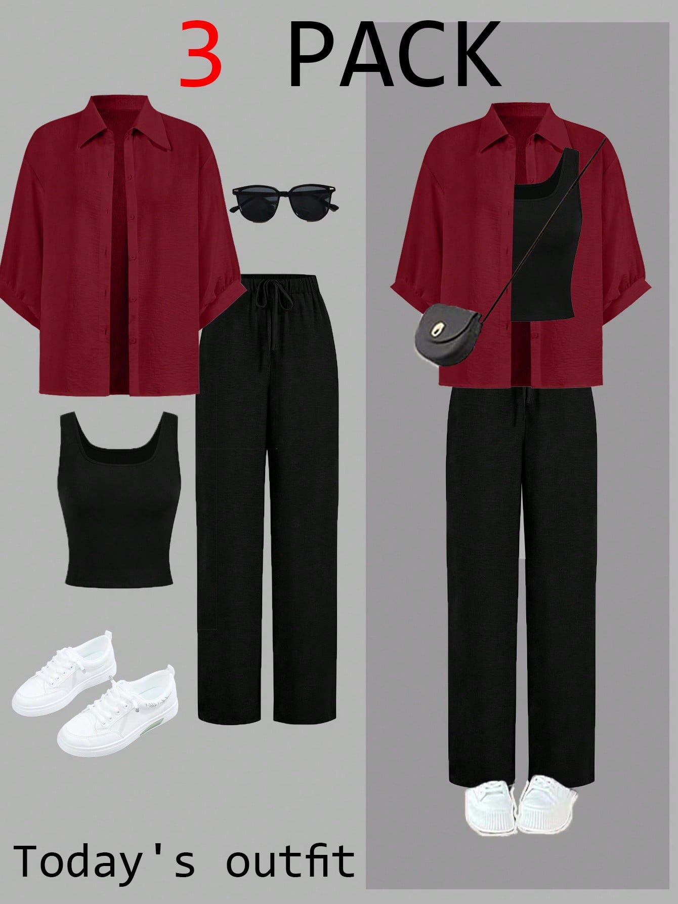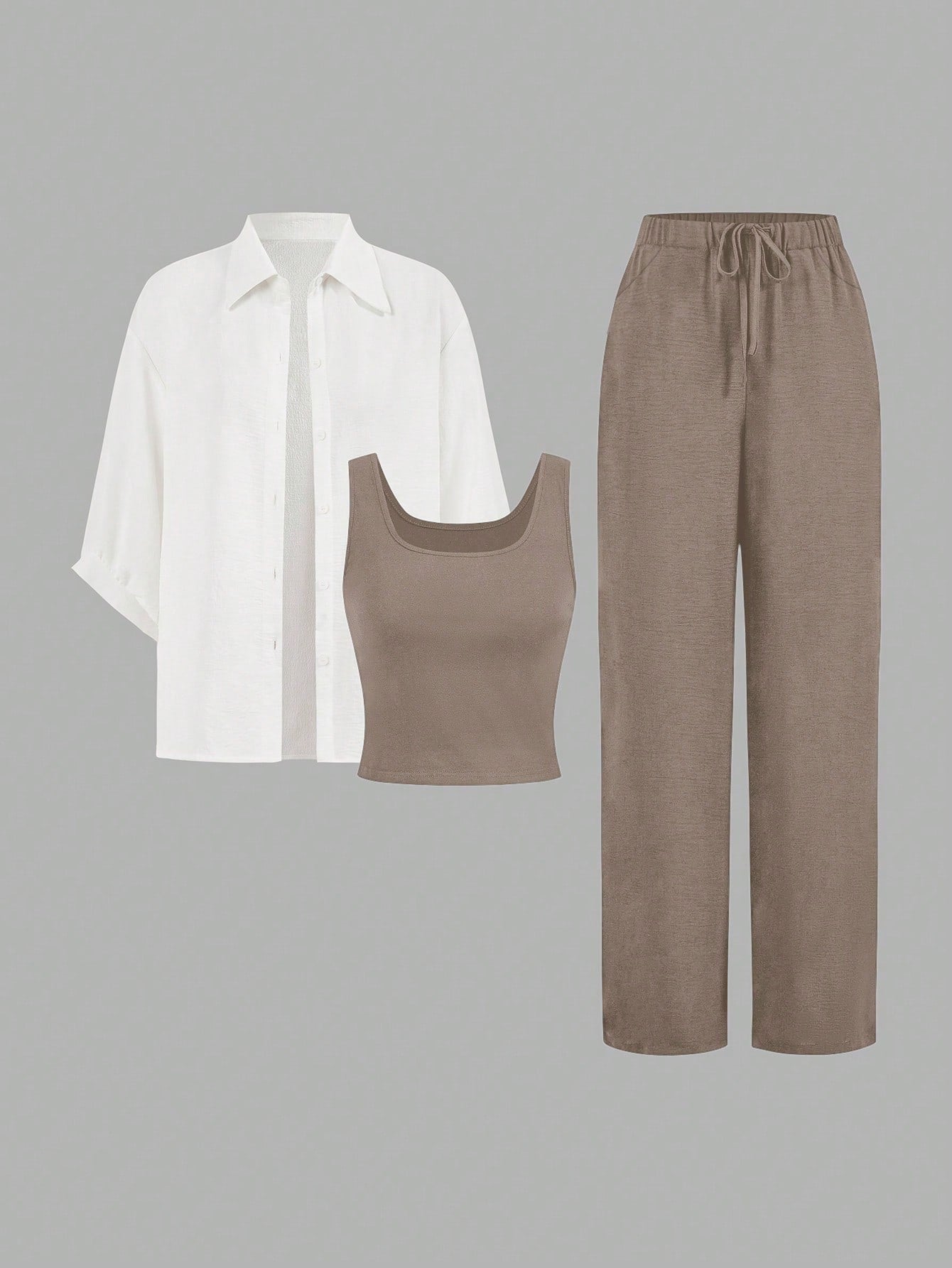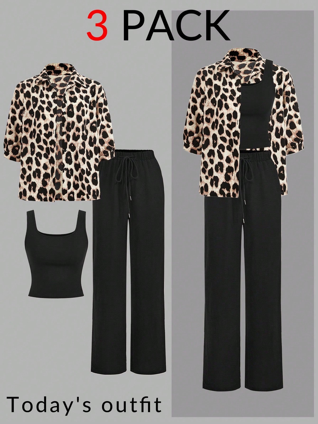 SHEIN LUNE 3pcs Black & White Maillard Women 2024 New Elegant Windbreaker Suit Set With Blouse And Wide Leg Pants, Stylish And Slimming, Autumn