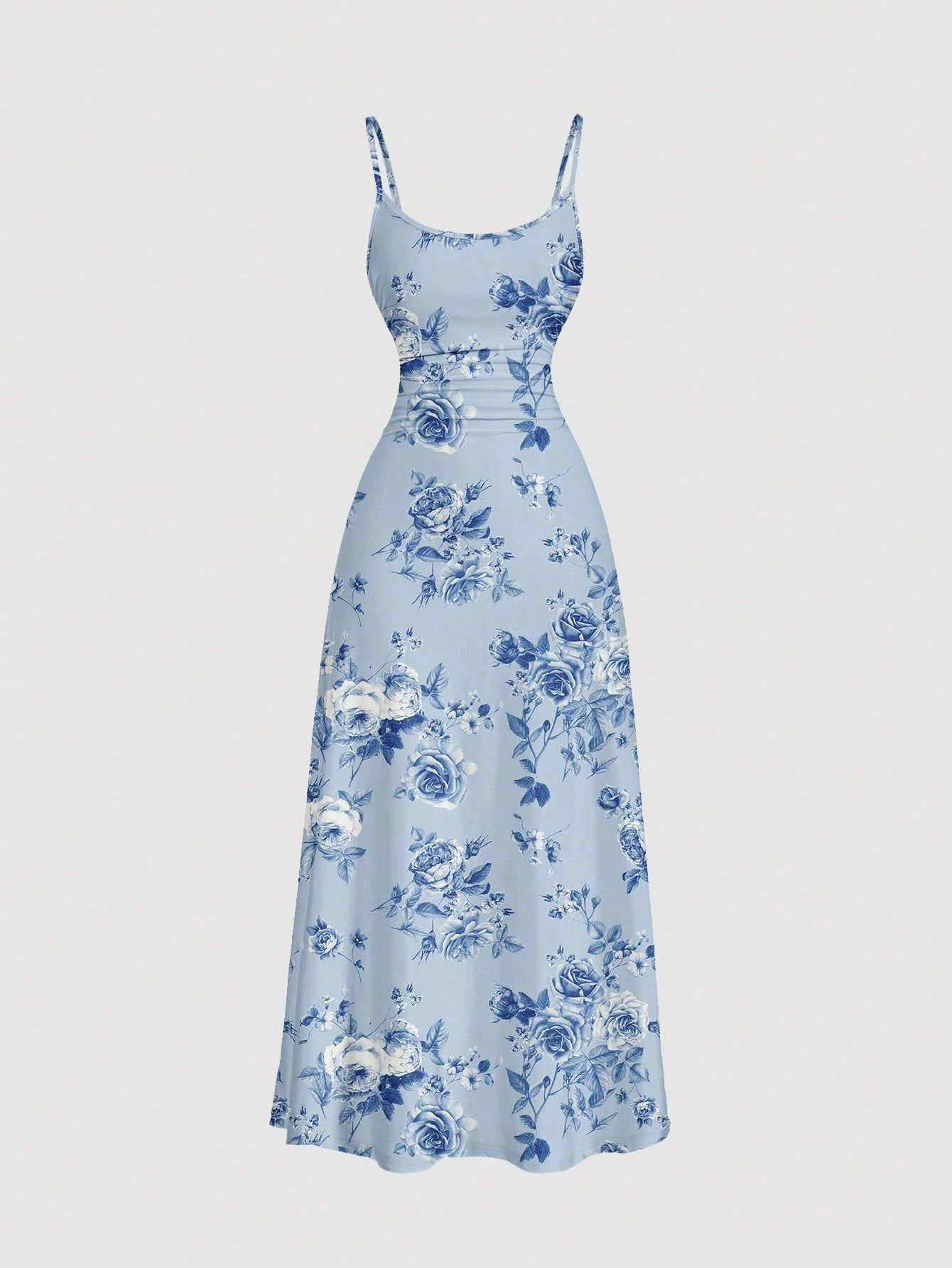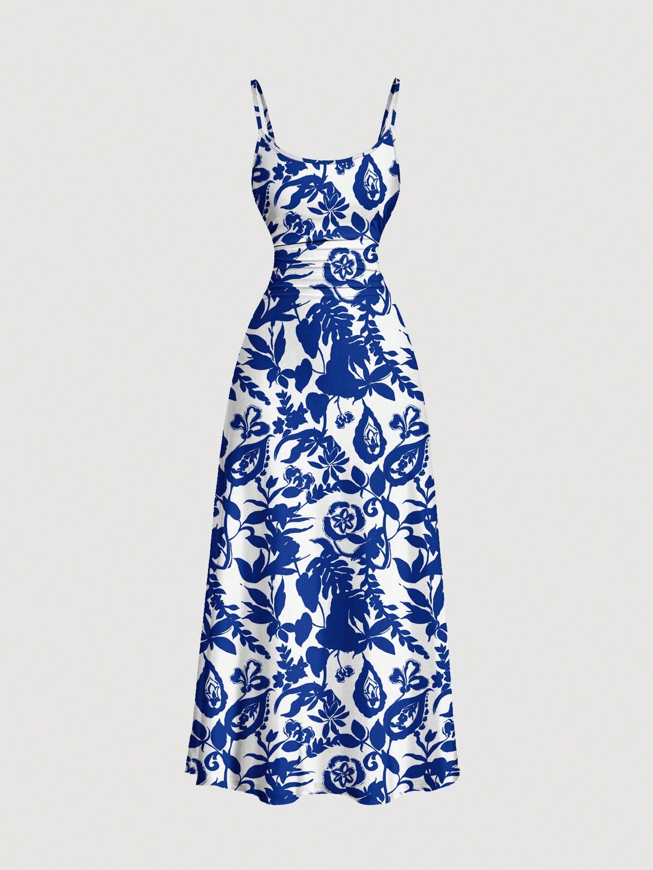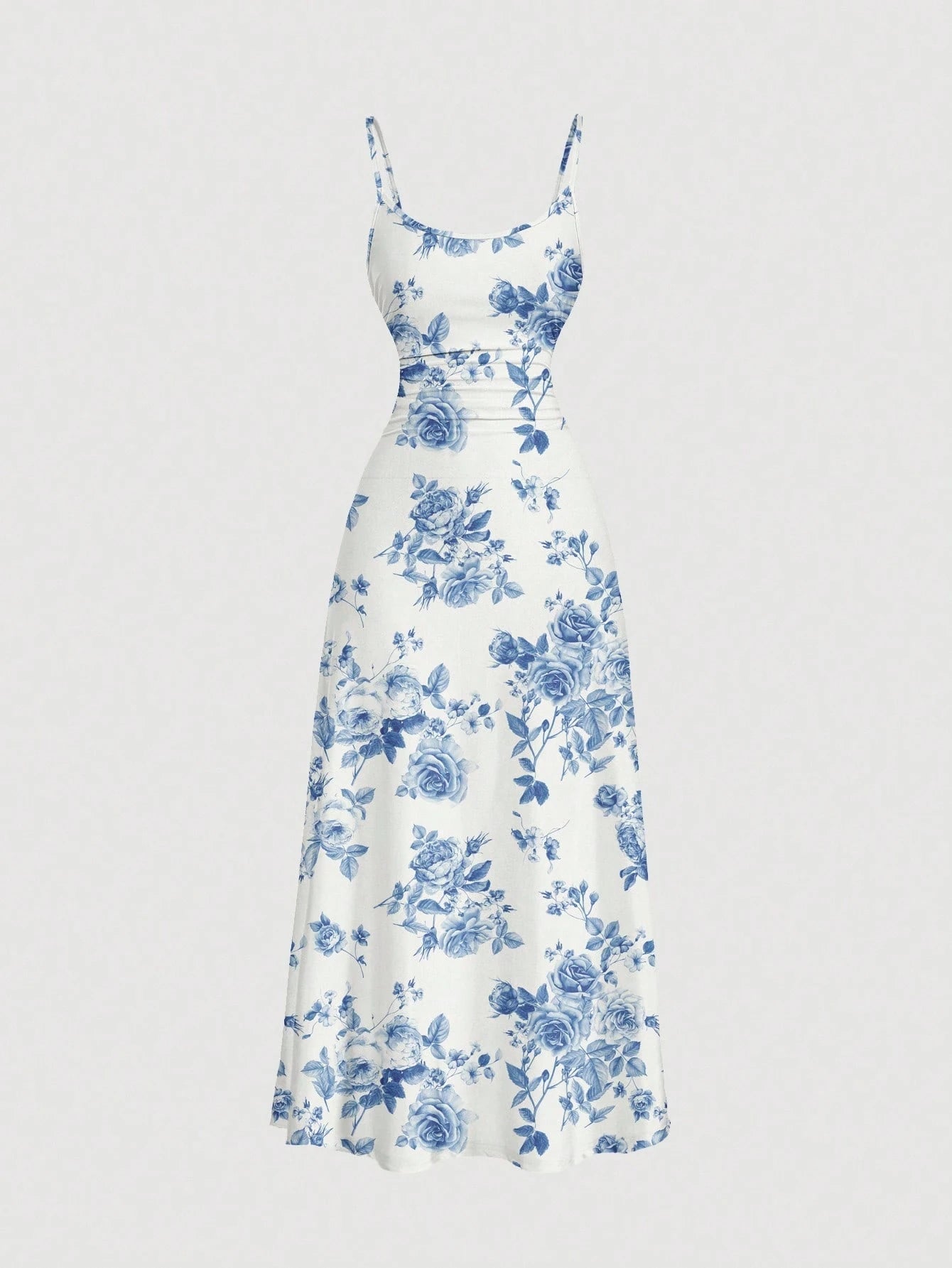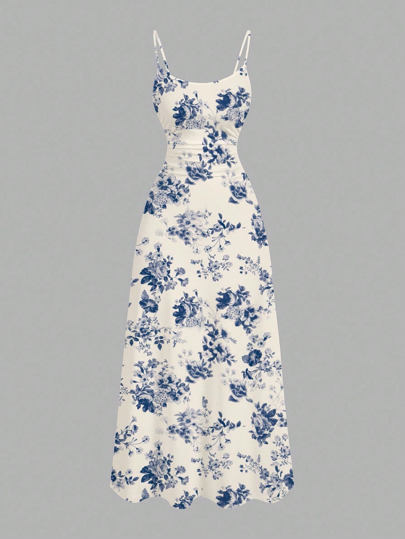 Women’s Blue & White Floral Print Maxi Dress – Boho Vacation Sundress with Ruched Waist & Spaghetti Straps, Elegant Summer Beach Outfit