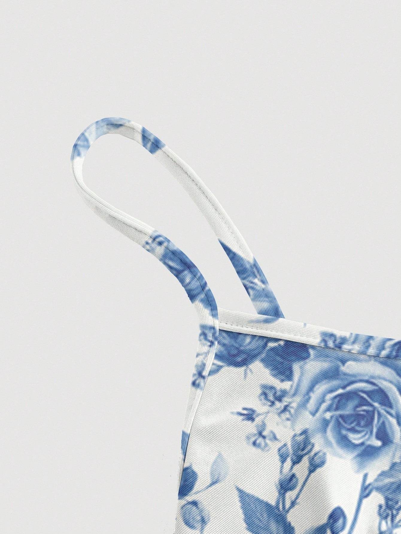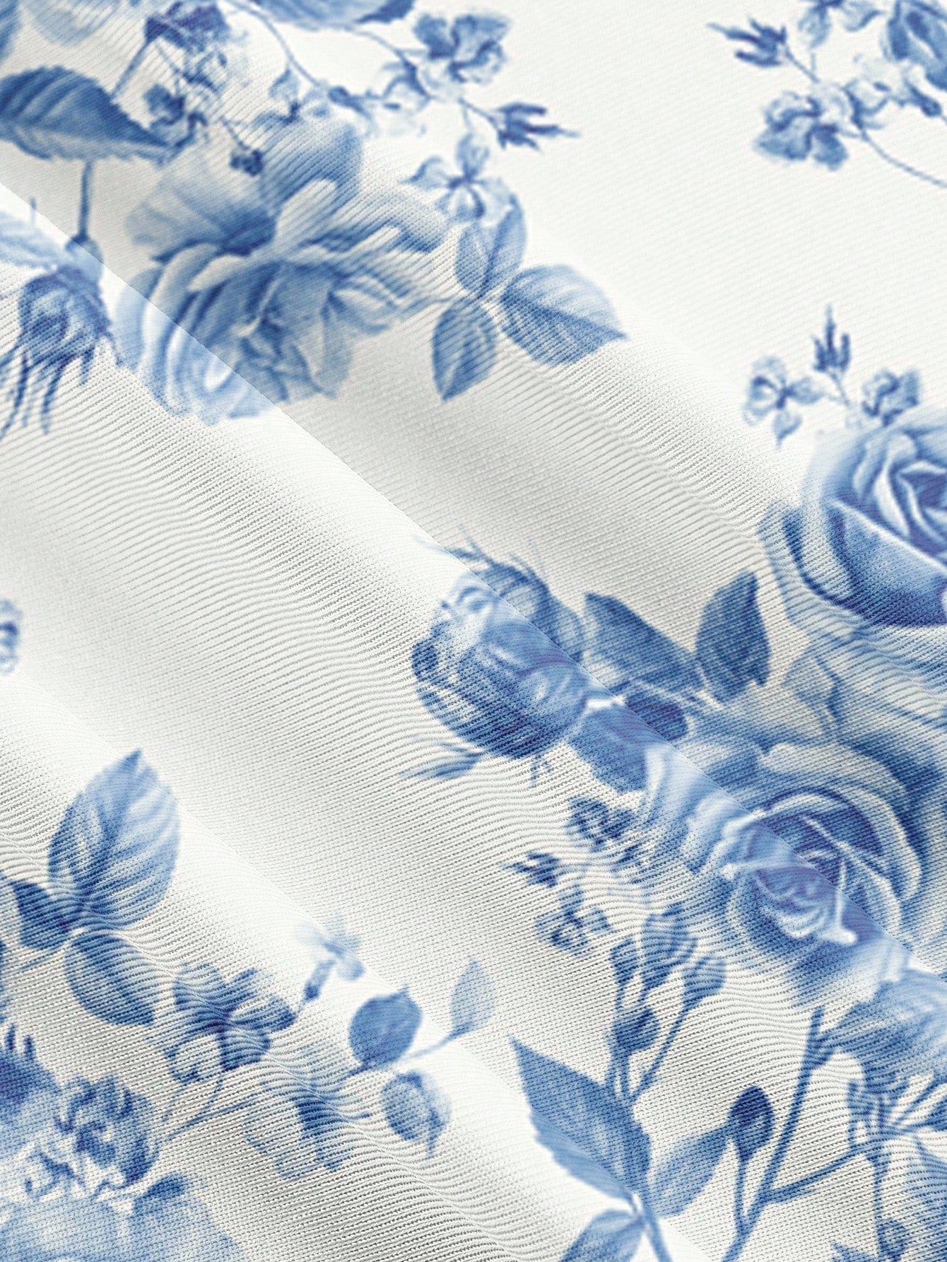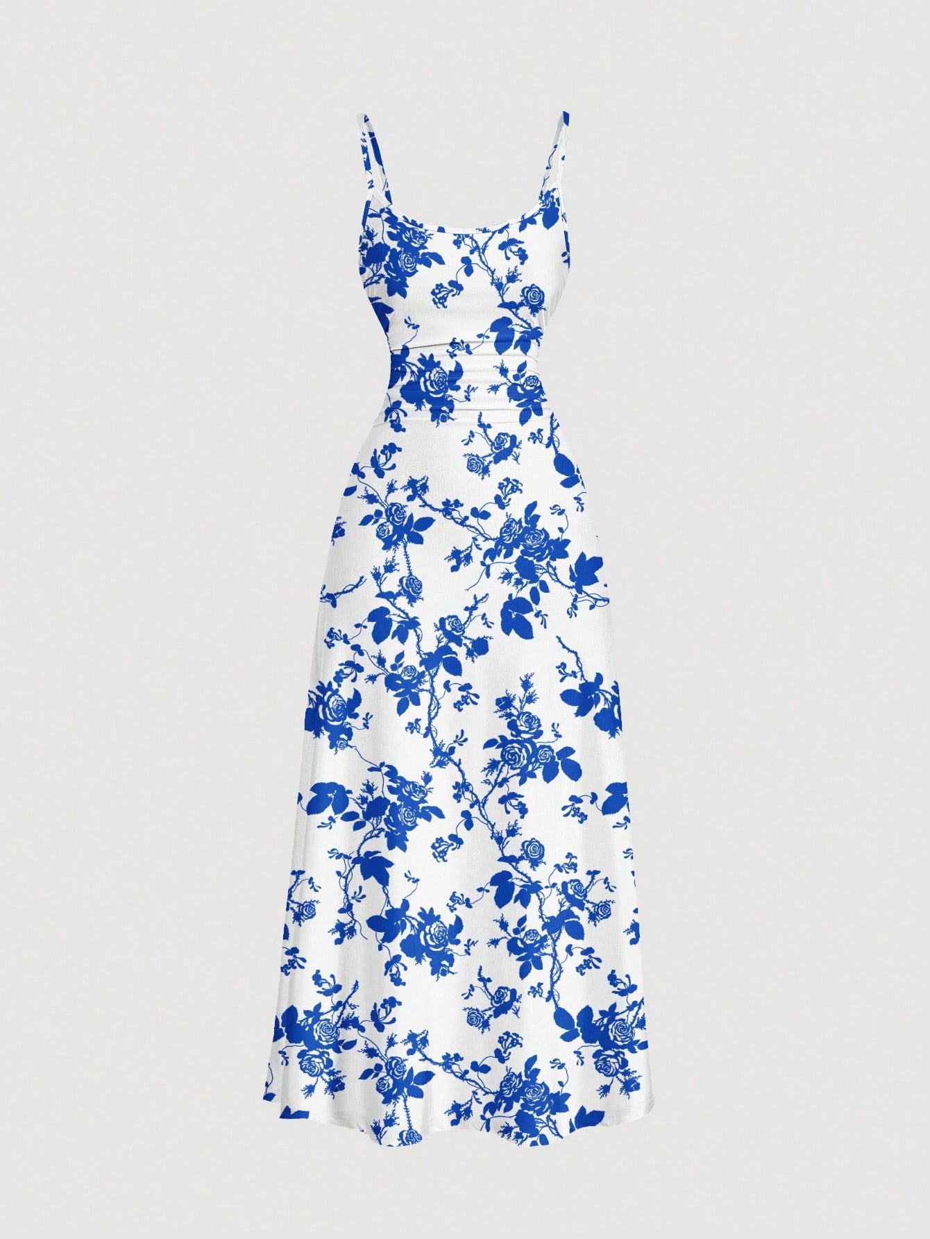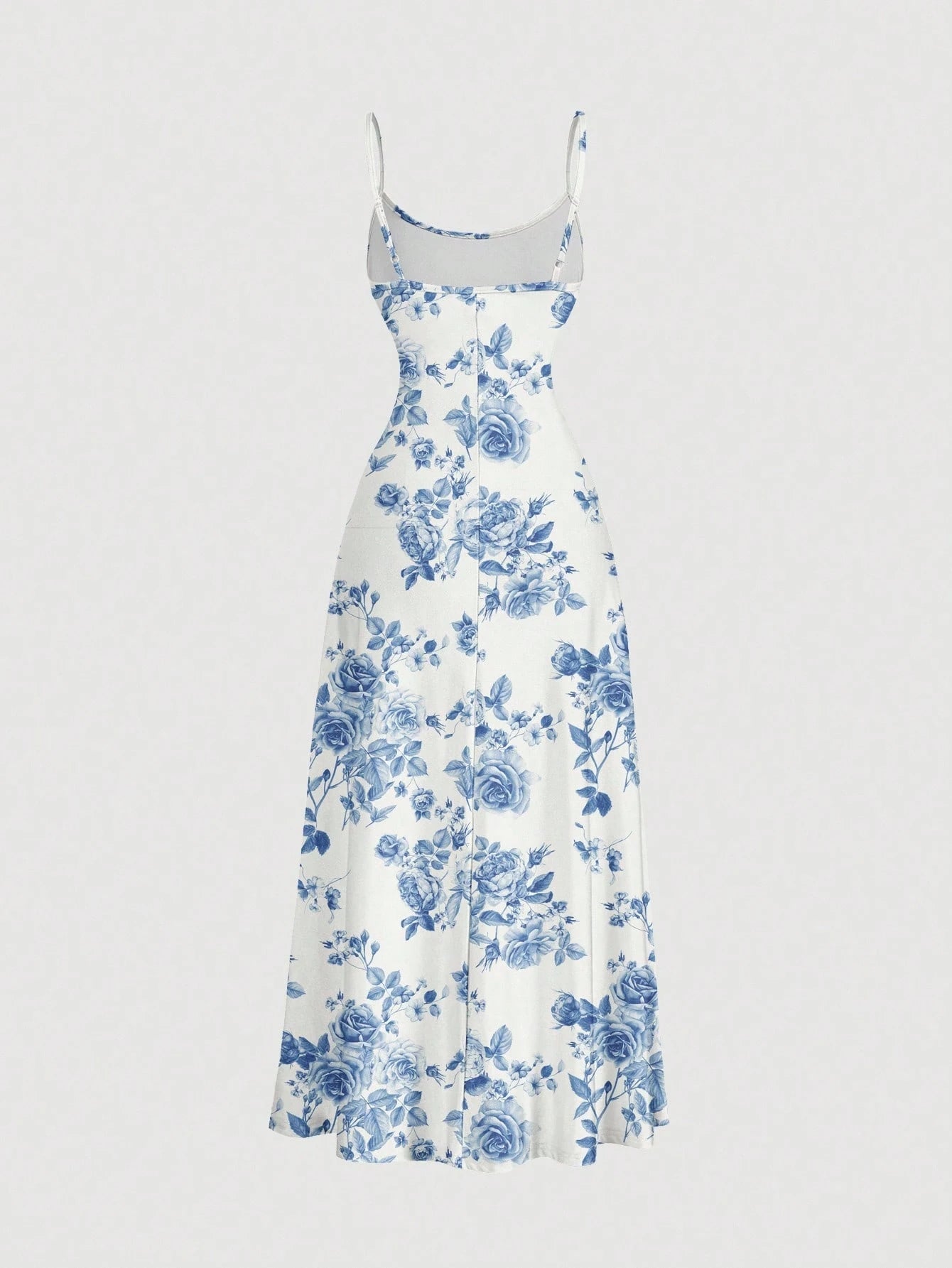 With its blue & white floral print, this long sundress brings timeless charm to your summer wardrobe, perfect for resort wear, garden parties, or elegant evening strolls.