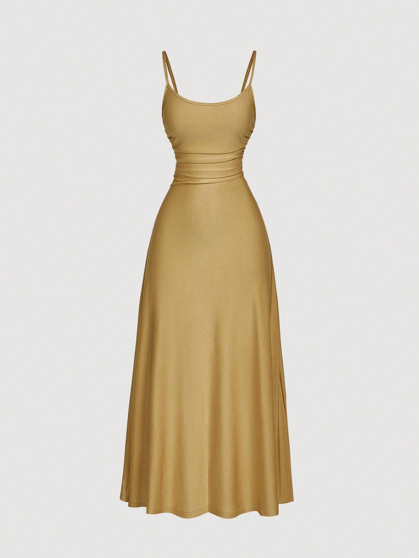 Yozy Women’s Elegant Ruched Waist Flared Hem Spaghetti Strap Dress – Long Brown Summer Maxi Dress for Formal, Cruise & Tea Party Events