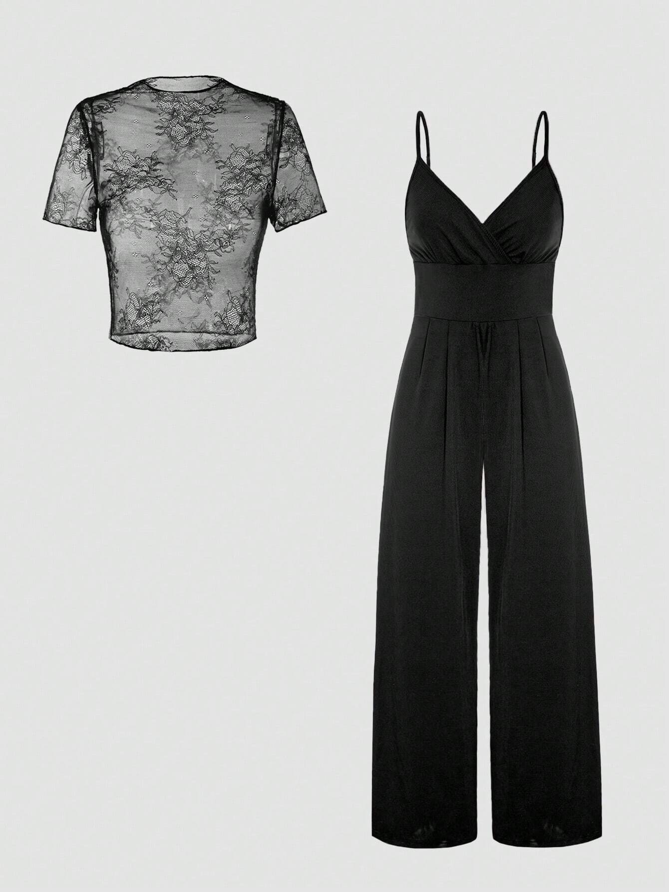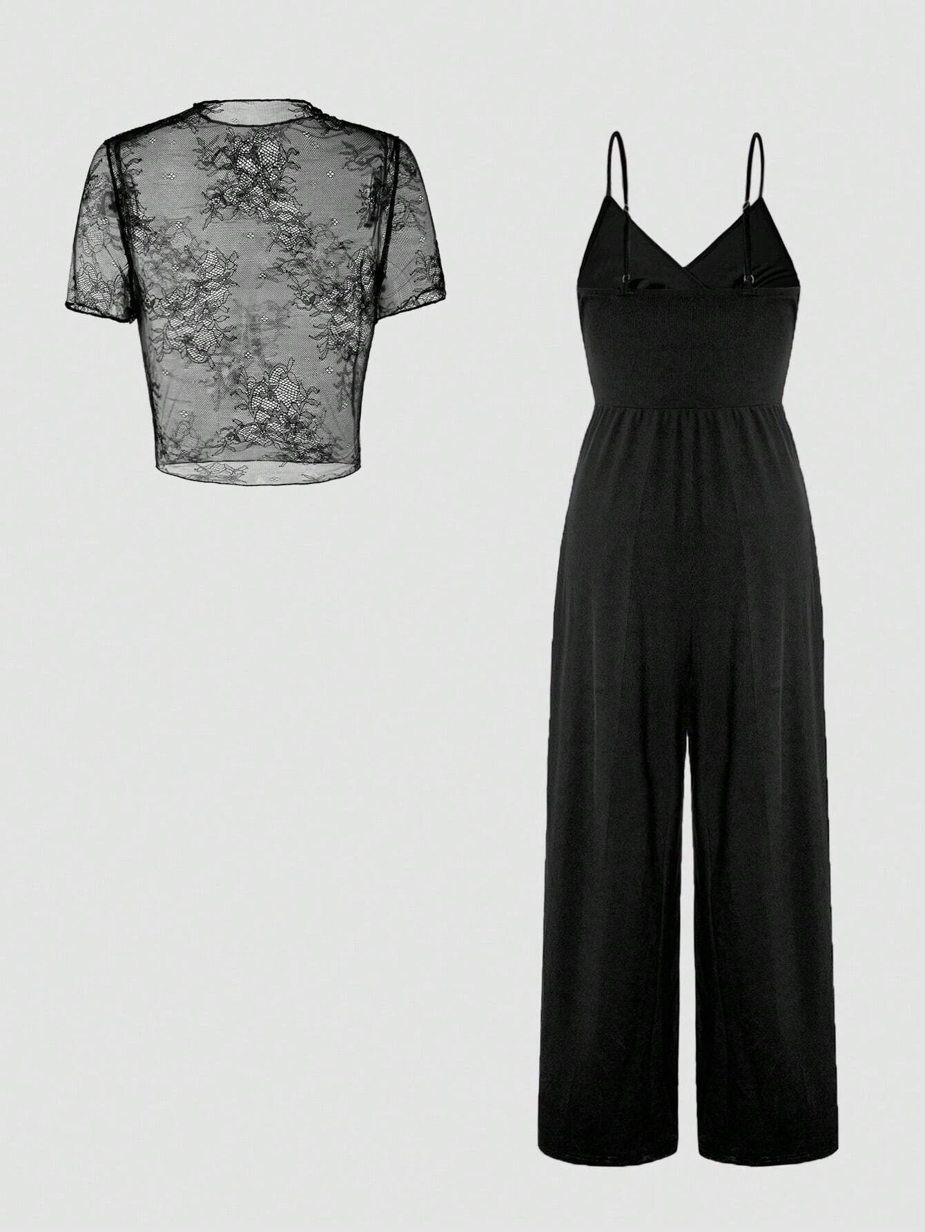 Women’s Lace See-Through Camisole & Jumpsuit Set – Elegant Black Two-Piece Outfit for Formal, Evening & Daily Wear